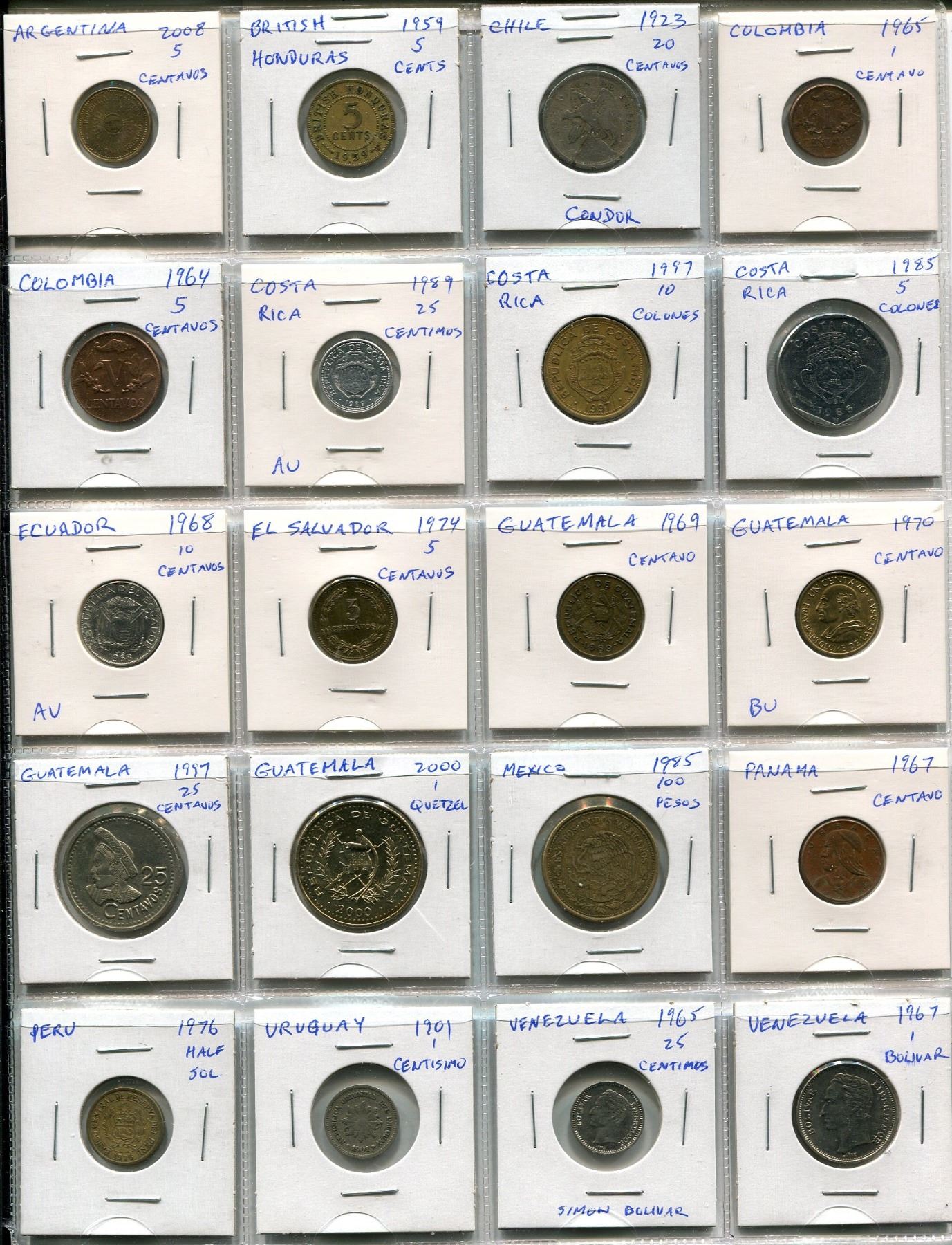 LOT OF 20 DIFFERENT LATIN AMERICAN COINS FROM ARGENTINA, BRITISH HONDURAS, CHILE, COLOMBIA, COSTA RICA, ECUADOR, EL SALVADOR, GUATEMALA, MEXICO, PANAMA, PERU, URUGUAY AND VENEZUELA.