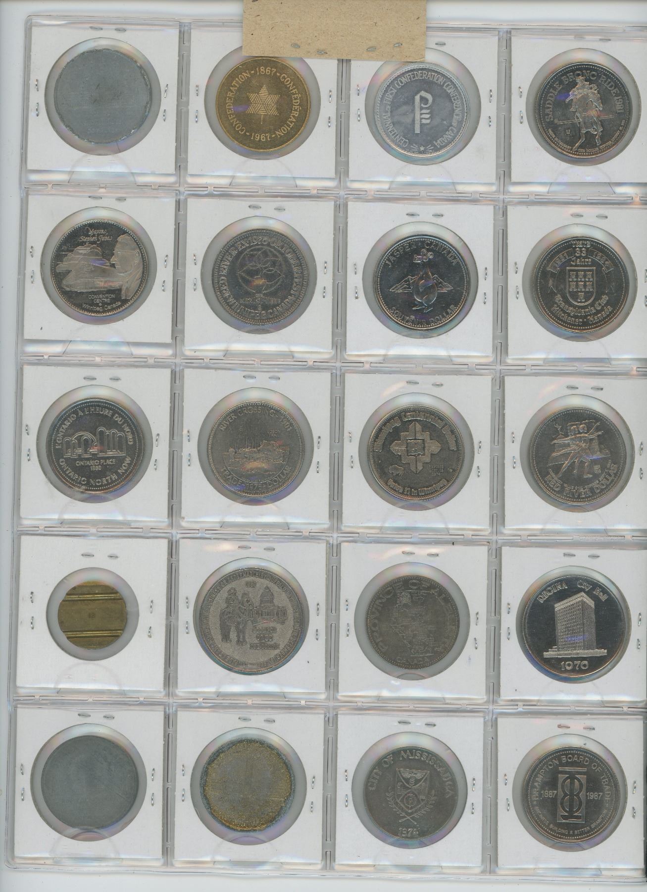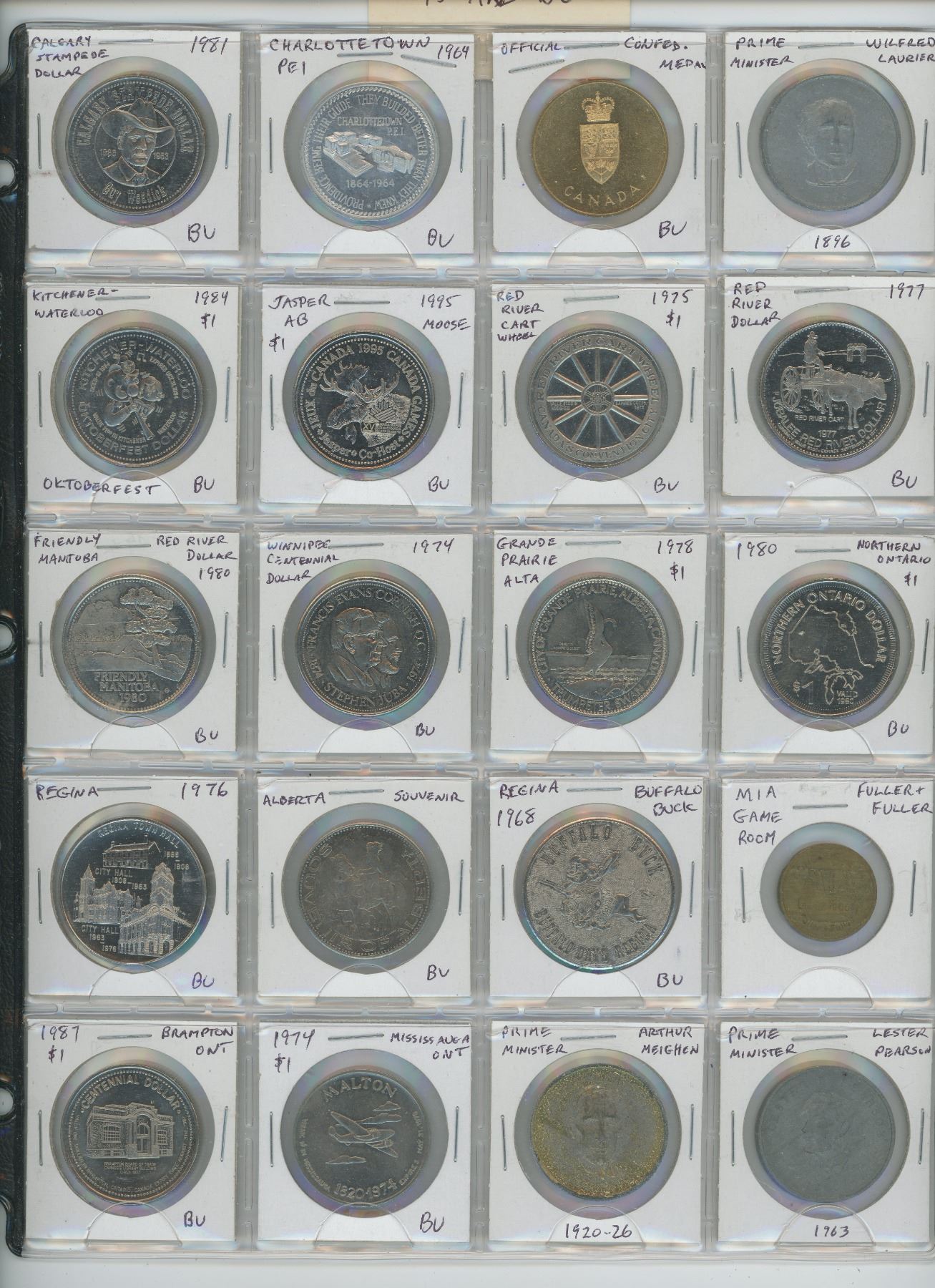 LOT OF 20 DIFFERENT TRADE DOLLARS & MEDALS. INCLUDES CALGARY STAMPEDE, CENTENNIAL, CHARLOTTETOWN PEI, KITCHENER-WATERLOO, RED RIVER, BRAMPTON ETC. 15 ARE BU.