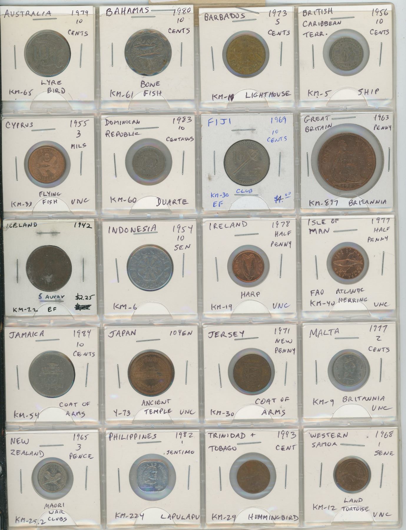LOT OF 20 DIFFERENT WORLD COINS FROM 20 ISLAND NATIONS: AUSTRALIA, BAHAMAS, BARBADOS, BRITISH CARIBBEAN TERR., CYPRUS, DOMINICAN REPUBLIC, FIJI, GREAT BRITAIN, ICELAND, INDONESIA, IRELAND, ISLE OF MAN, JAMAICA, JAPAN, JERSEY, MALTA, NEW ZEALAND, PHILIPPINES, TRINIDAD & TOBAGO AND WESTERN SAMOA. 6 COINS UNC.
