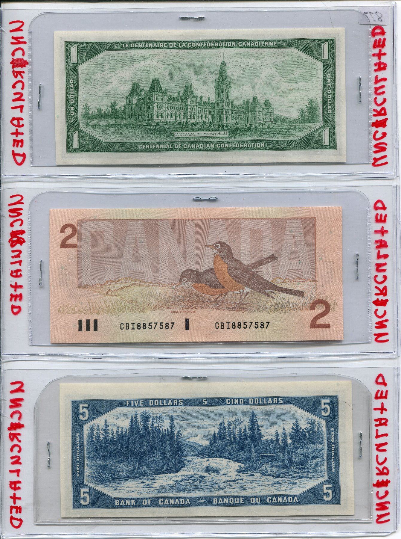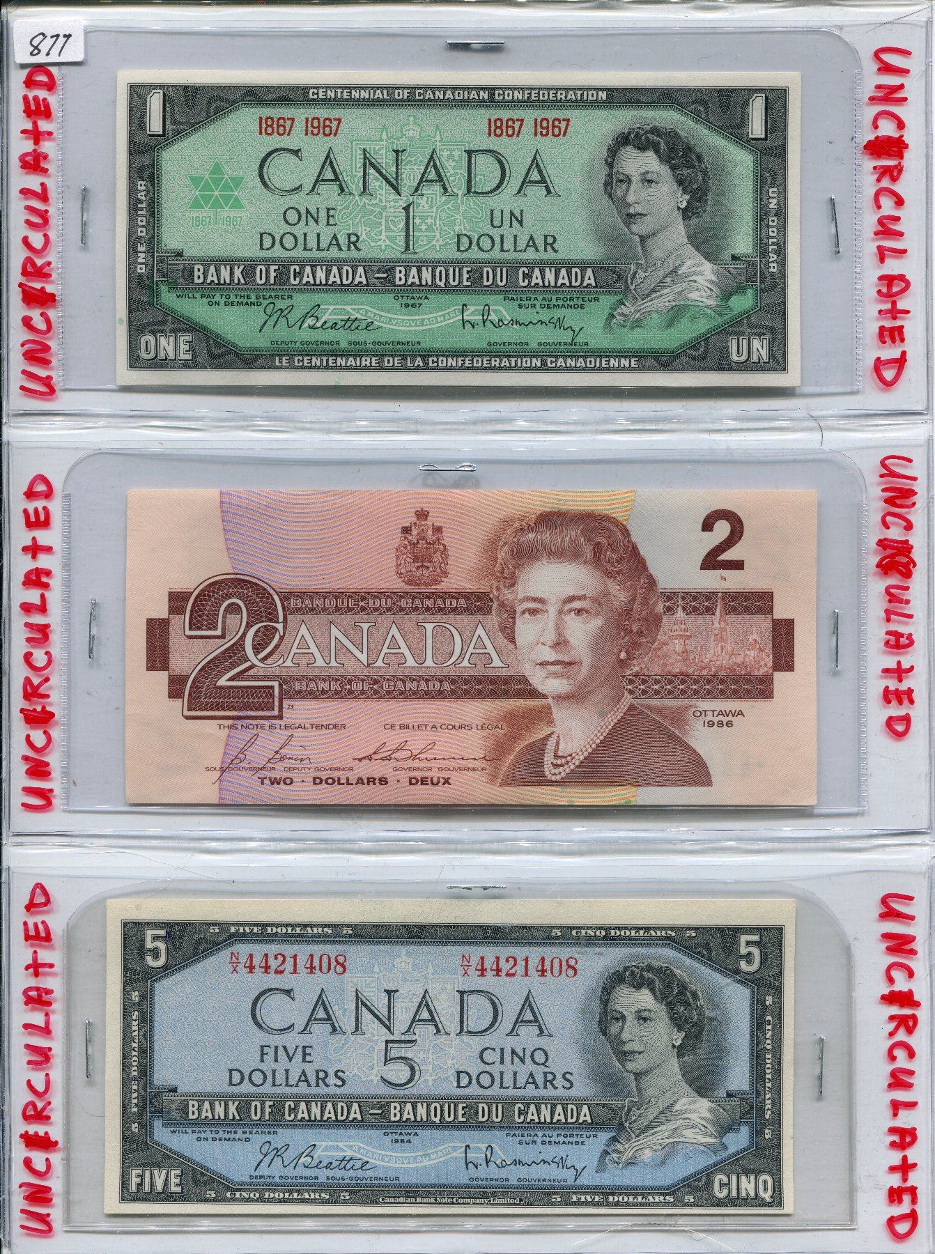 LOT OF 3 CNDN BANK NOTES (1967 ONE DOLLAR, 1986 TWO DOLLAR & 1954 FIVE DOLLAR)