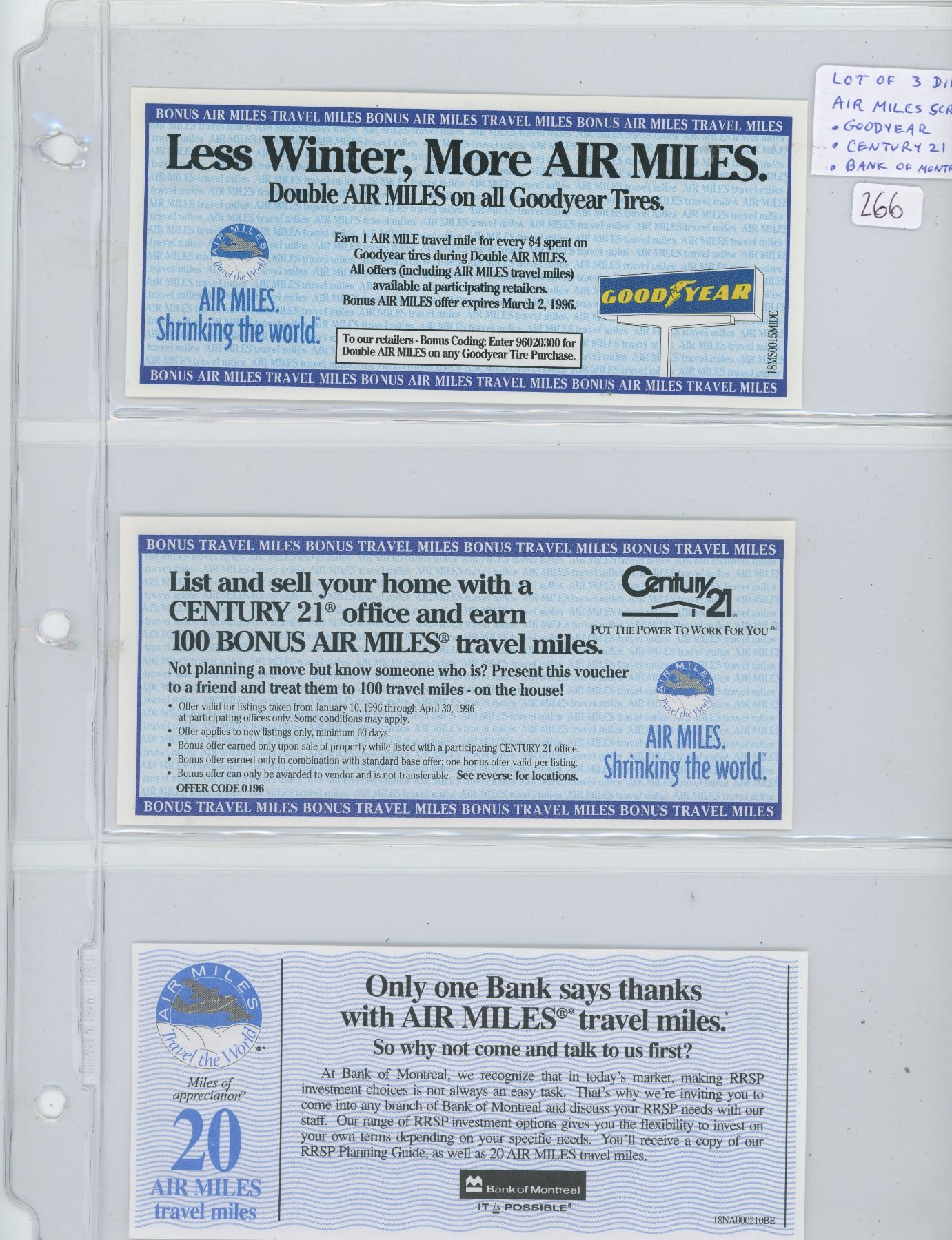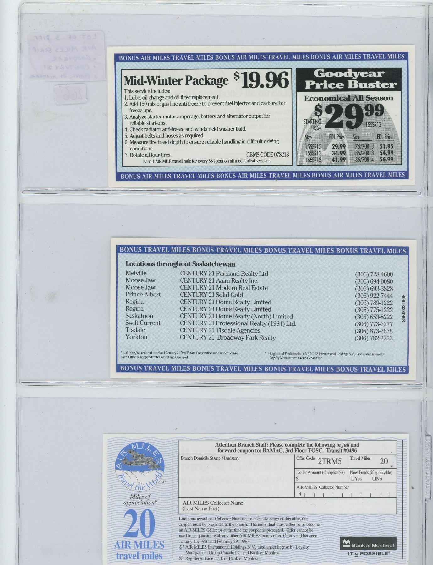 LOT OF 3 DIFFERENT AIR MILES SCRIP: GOODYEAR, CENTURY 21 & BANK OF MONTREAL.