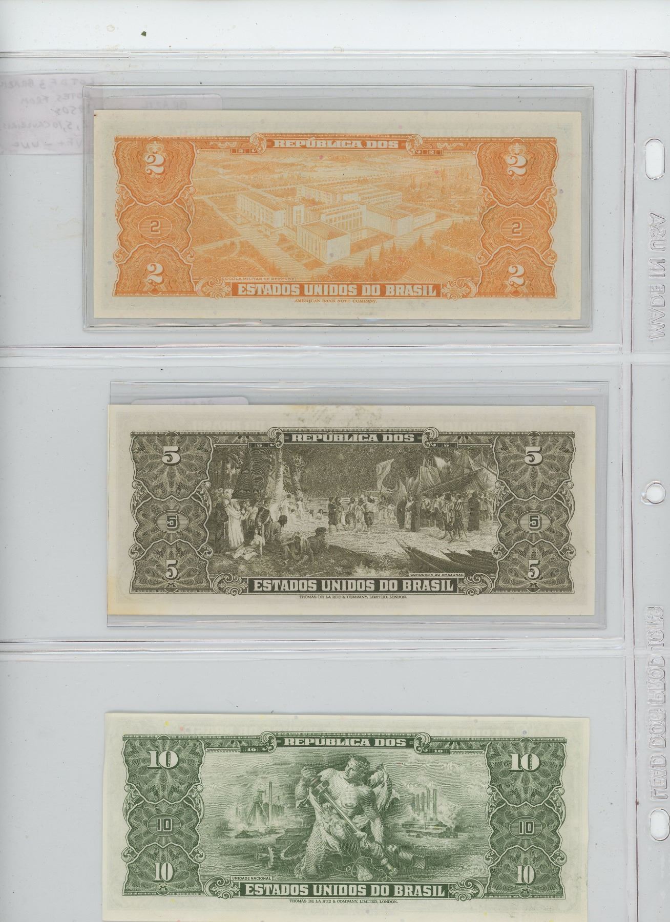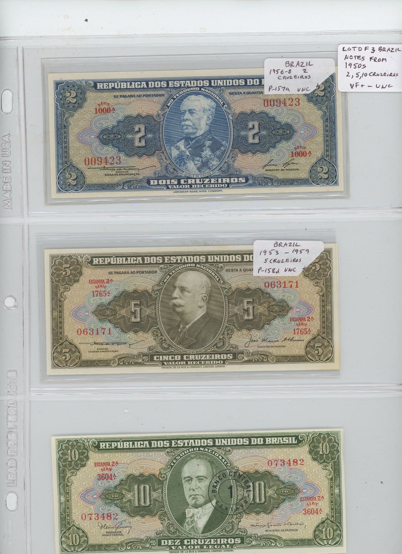 LOT OF 3 DIFFERENT BRAZILIAN NOTES FROM THE 1950S: 2 CRUZEIROS, 5 CRUZEIROS, 10 CRUZEIROS. VF+ - UNC.