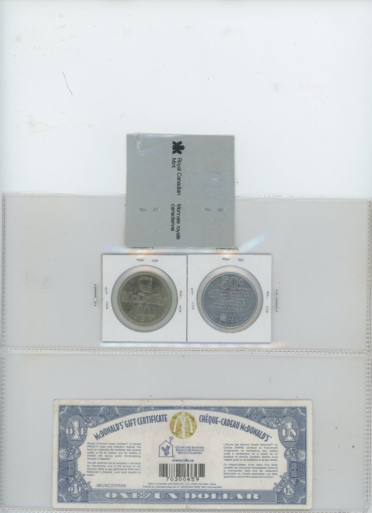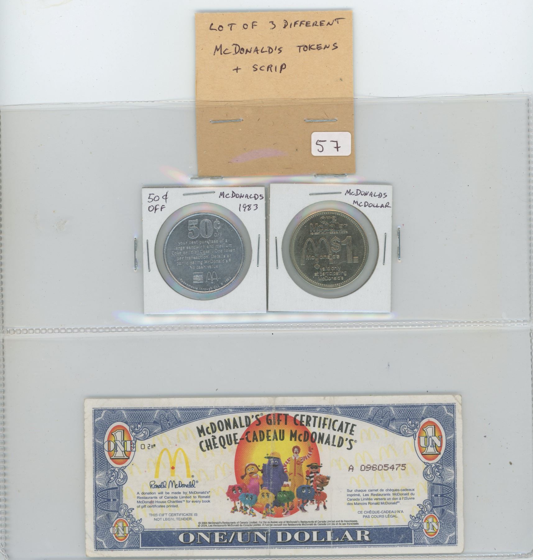 LOT OF 3 DIFFERENT MCDONALD’S TOKENS & SCRIP. INCLUDES 50 CENTS OFF, MCDOLLAR AND $1 GIFT CERTIFICATE SCRIP.
