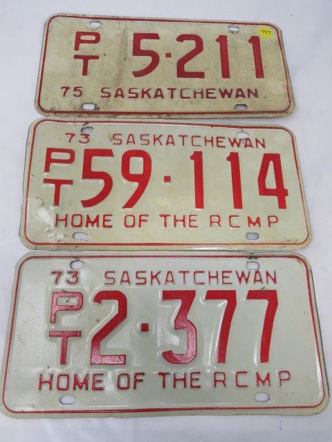 LOT OF 3 LICENSE PLATES (2 X 1973 SASK HOME OF THE RCMP, 1 X 1975)