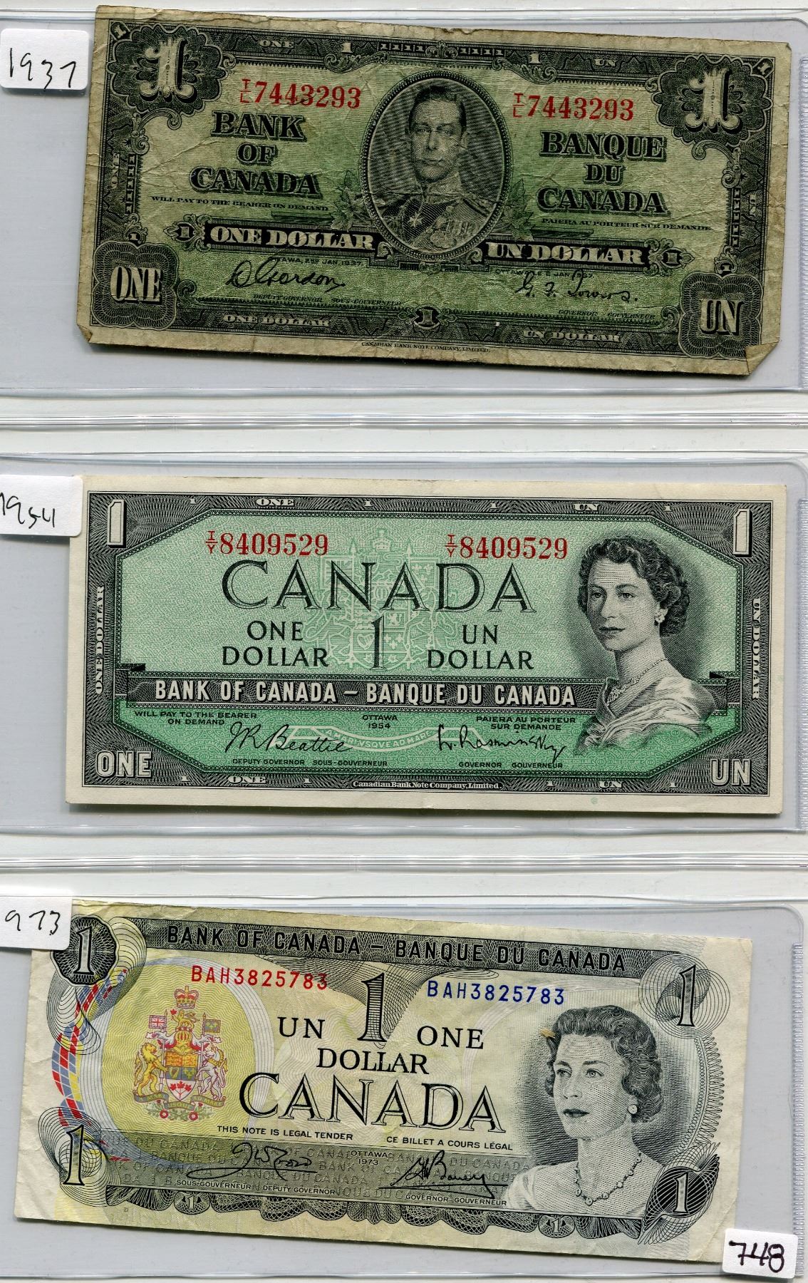 LOT OF 3 ONE DOLLAR BILLS (1937, 1954, 1973) *CANADA*