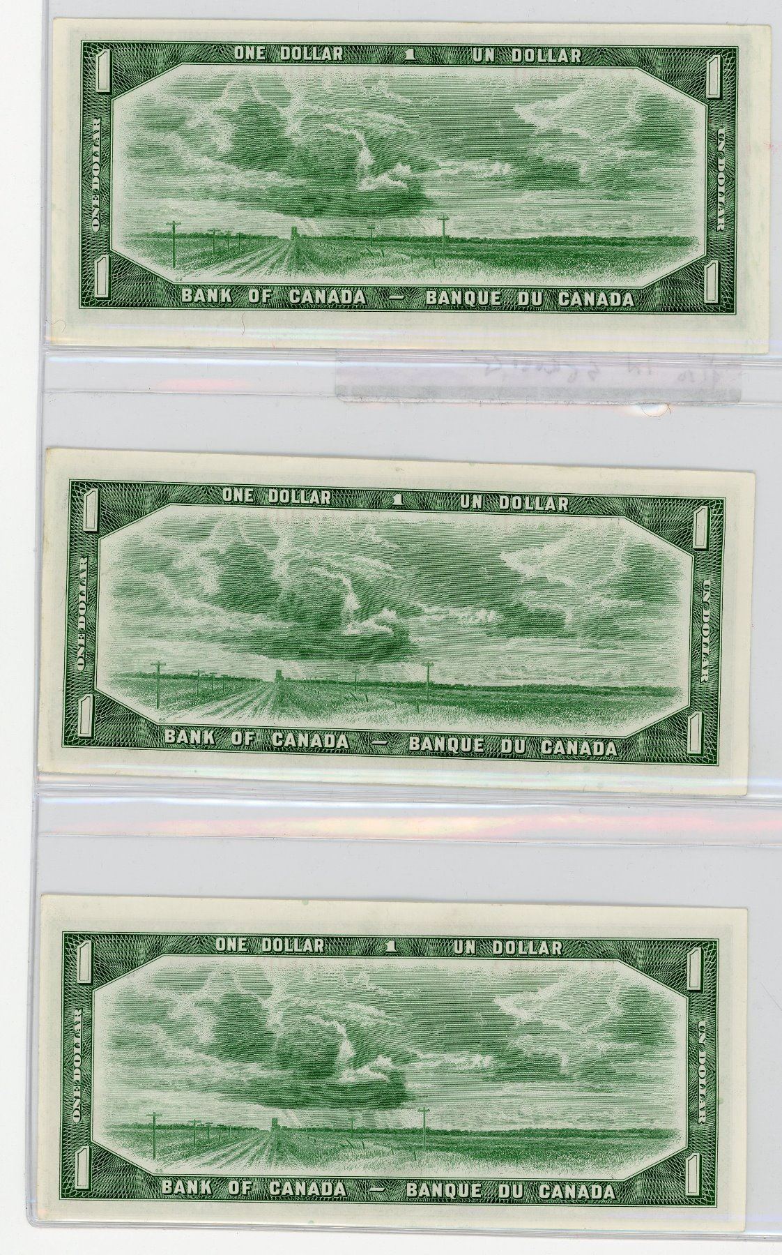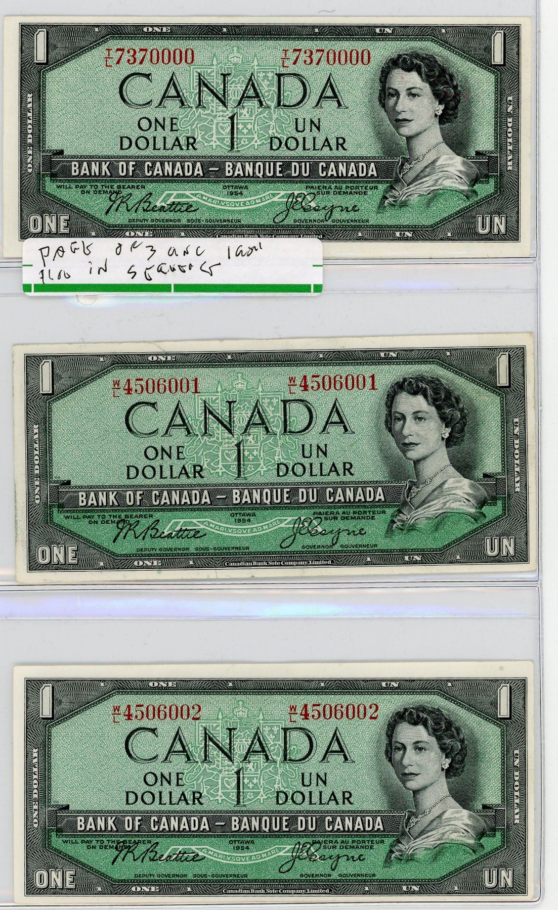 LOT OF 3 ONE DOLLAR BILLS (CANADA) *1954* (2 HAVE SEQUENCIAL SERIAL NUMBERS)