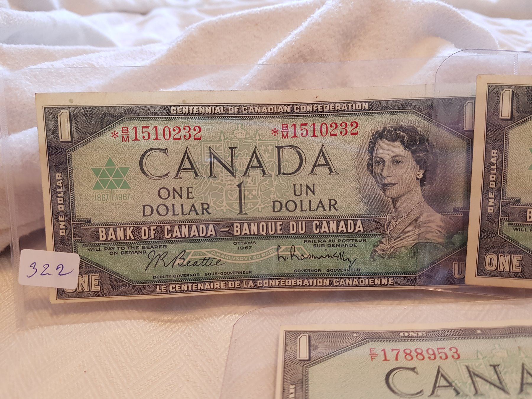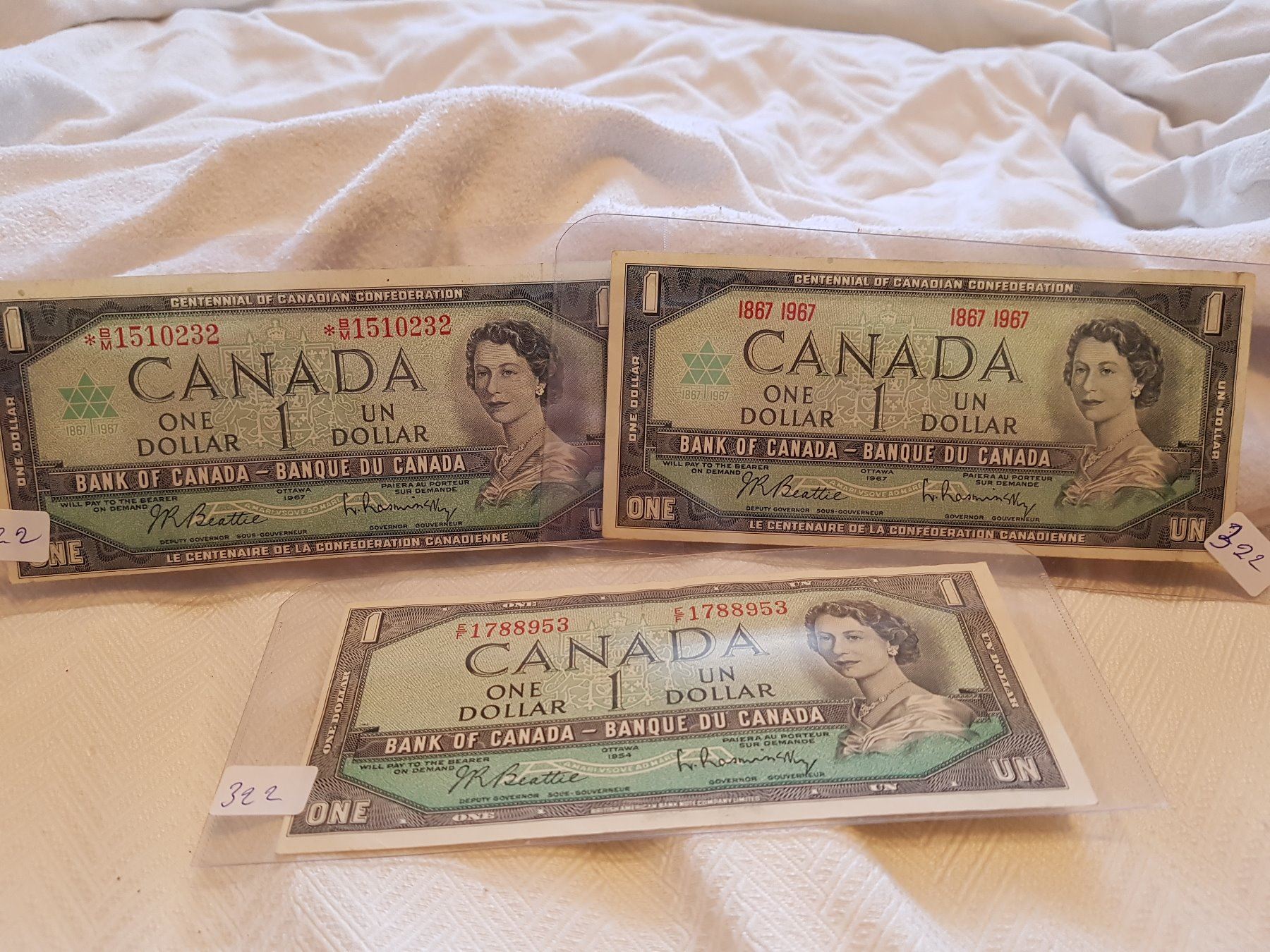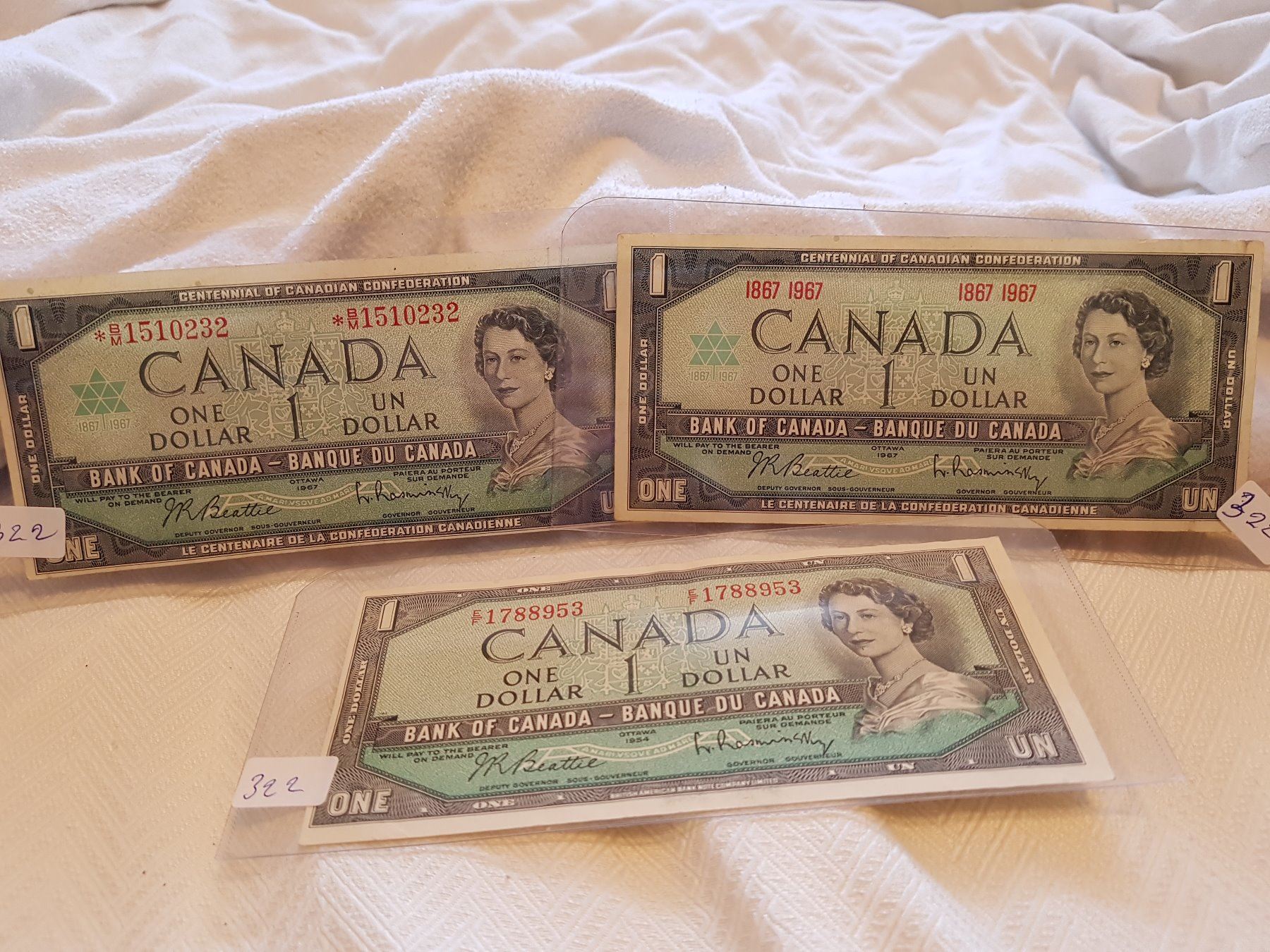 LOT OF 3-ONE DOLLAR BILLS (CANADA) *1967 REPLACEMENT-1967 NO SER #-1954*