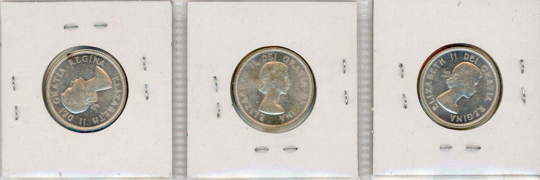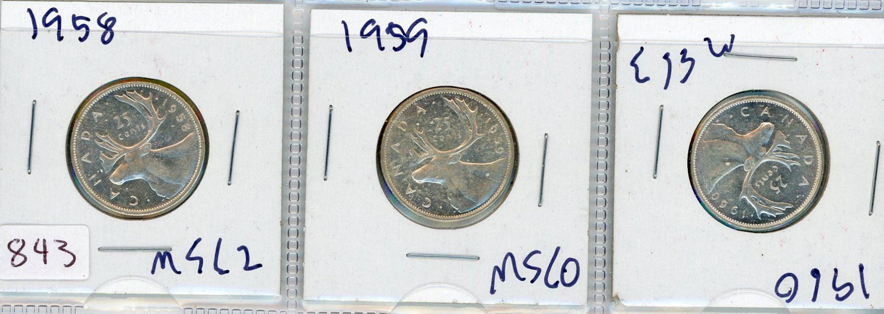 LOT OF 3 TWENTY FIVE CENT COINS (CANADIAN) *1958, 1959 & 1960* (SILVER)