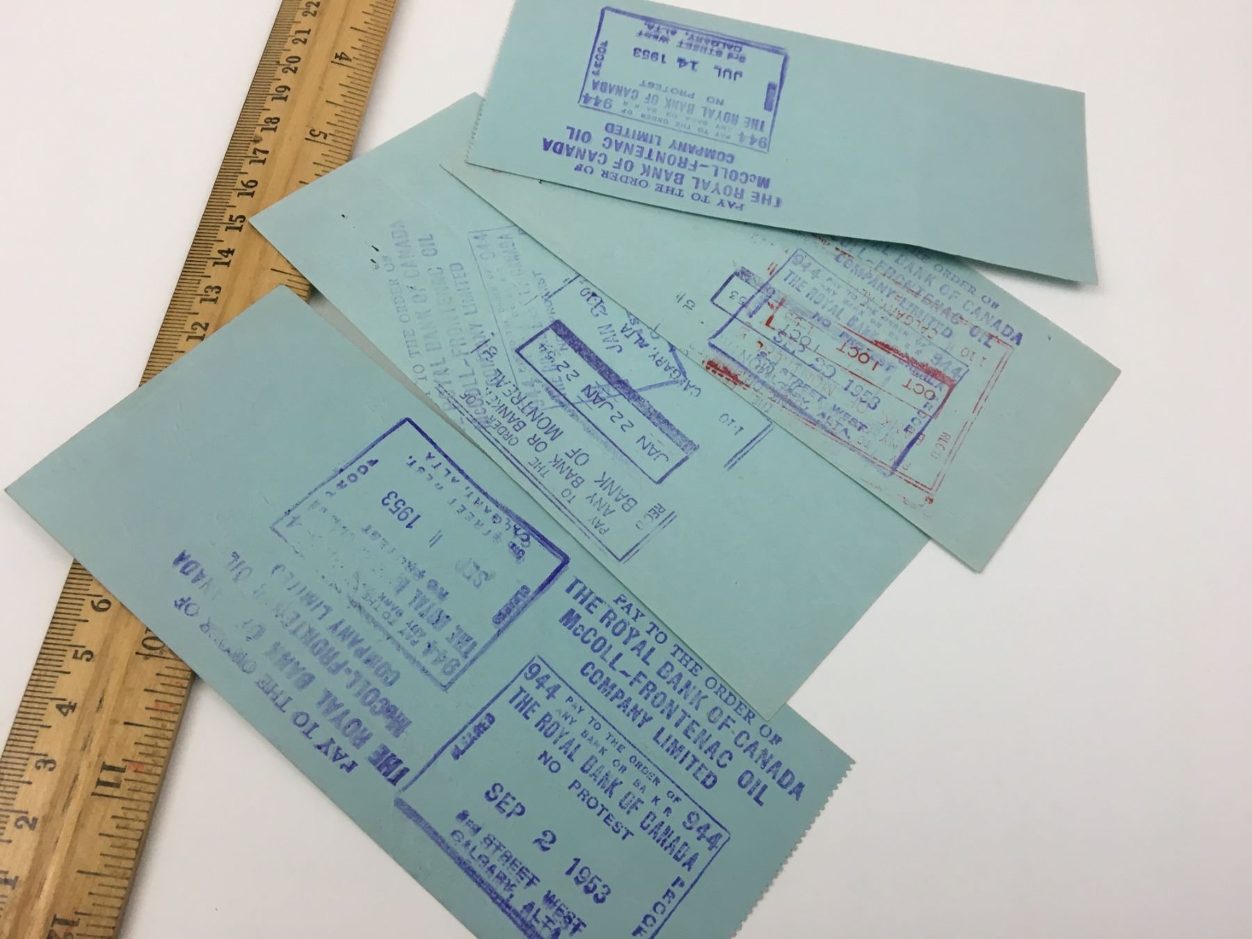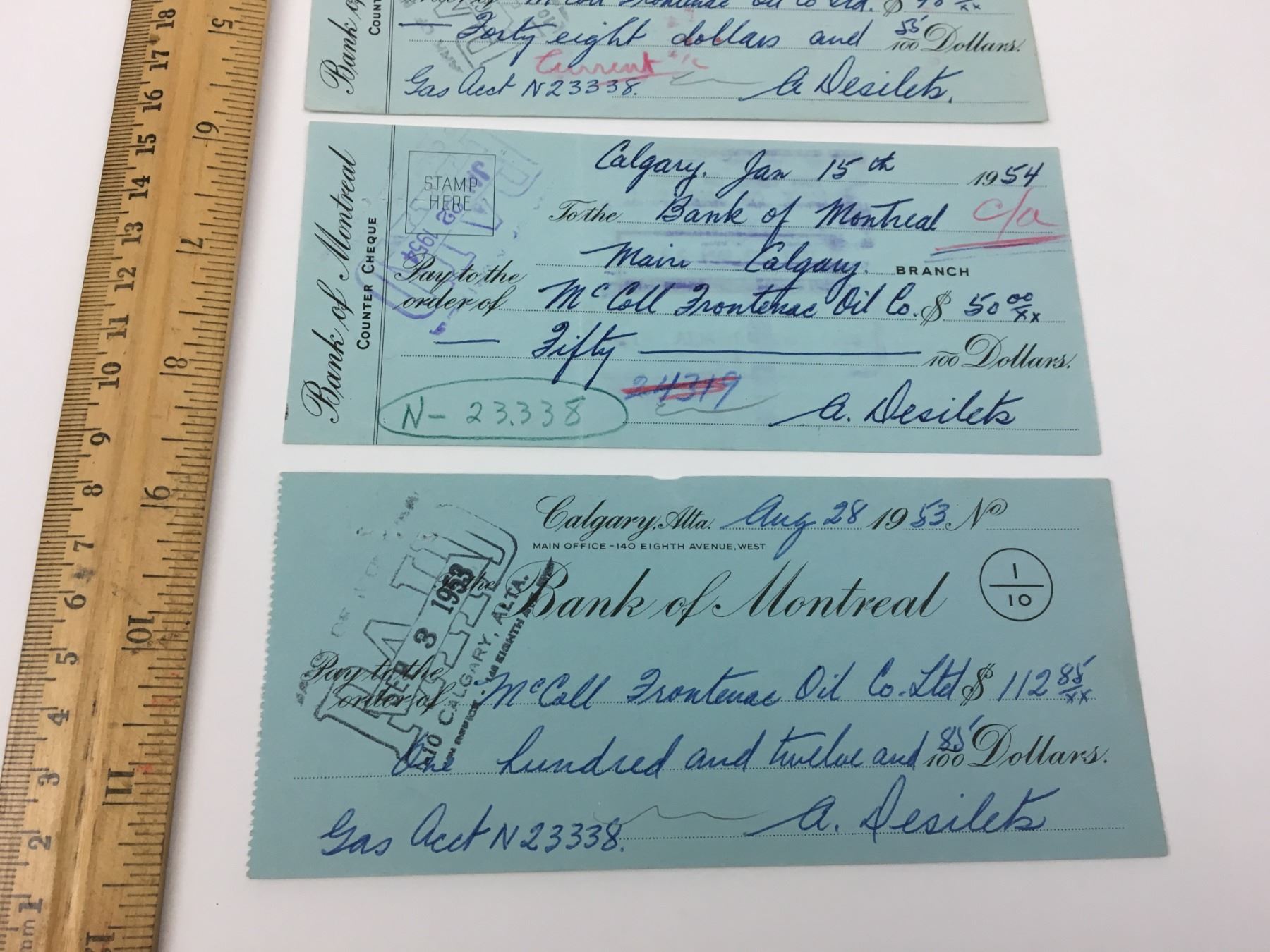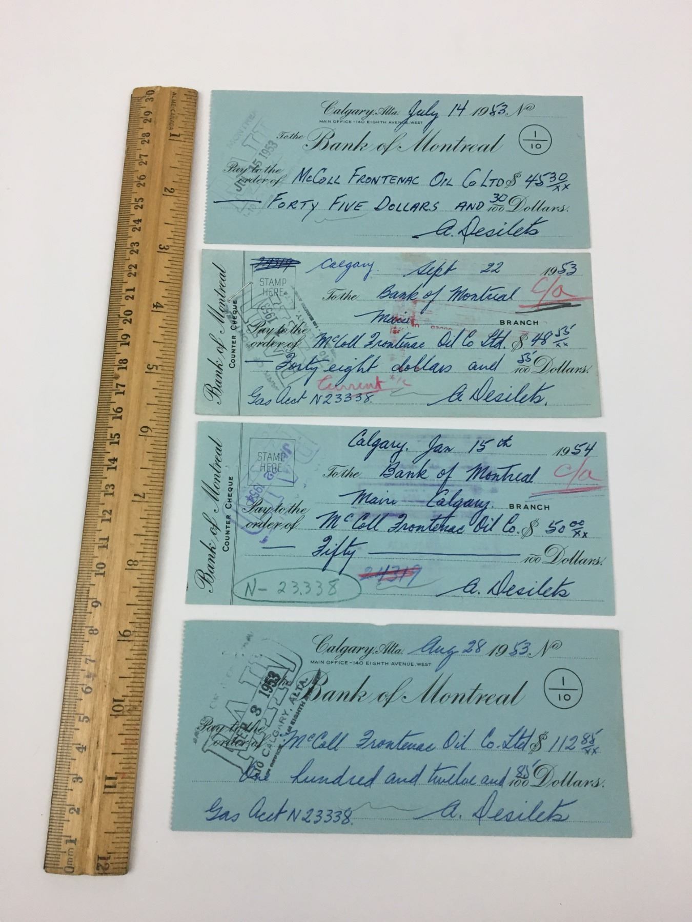 LOT OF 4 BANK OF MONTREAL CHEQUES PAID TO MCCOLL FRONTENAC OIL (1950'S)