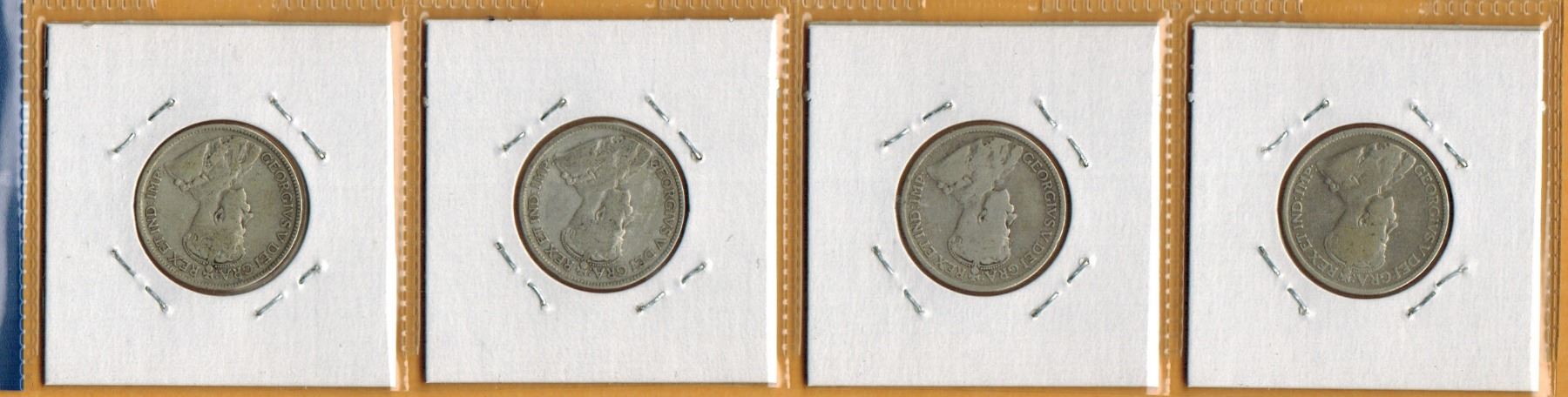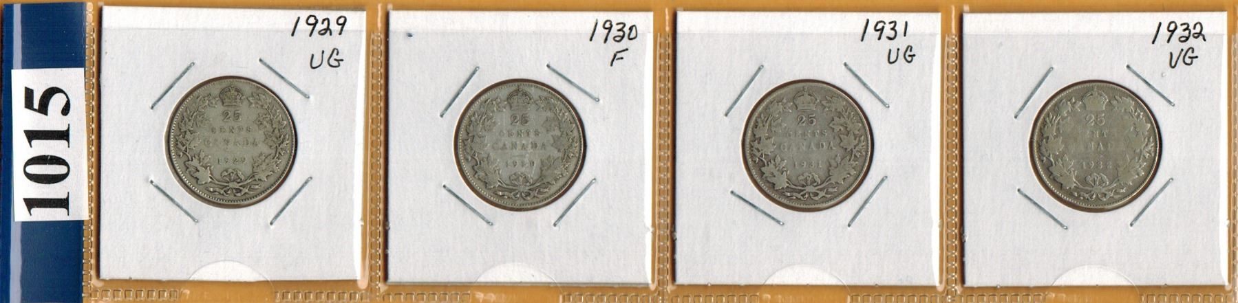 LOT OF 4 CANADIAN SILVER 25 CENT COINS (1929, 30, 31, 32)