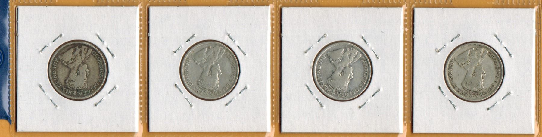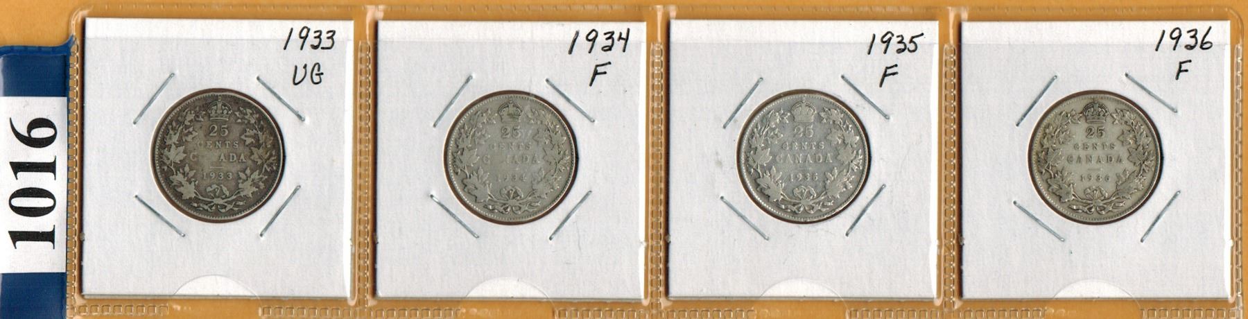 LOT OF 4 CANADIAN SILVER 25 CENT COINS (1933, 34, 35, 36)