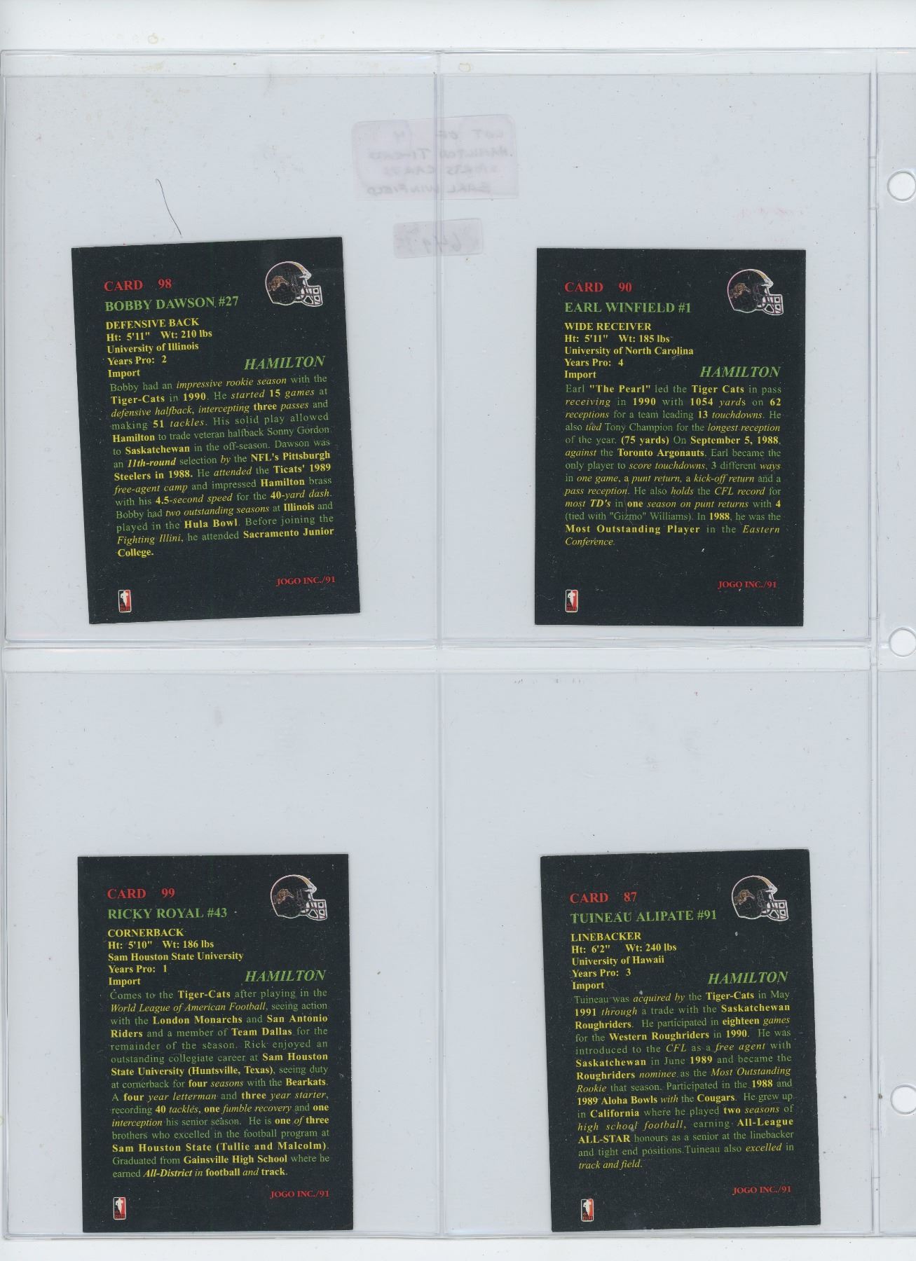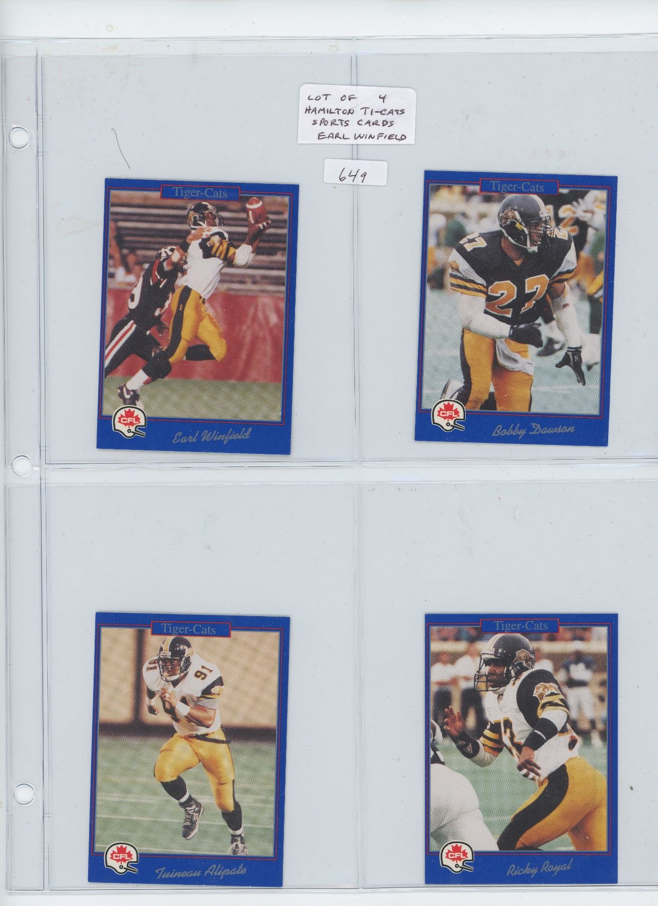 LOT OF 4 CFL HAMILTON TIGER-CATS 1994 SPORTS CARDS INCLUDING EARL WINFIELD, BOBBY DAWSON, TUINEAU ALIPATE, AND RICKY ROAYL. ALL UNC.