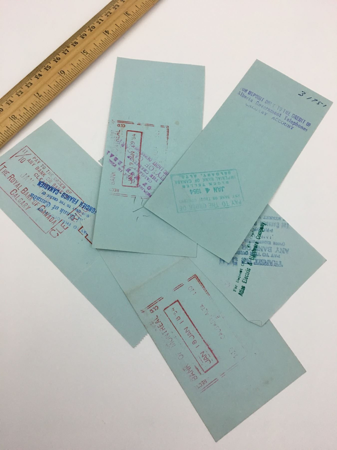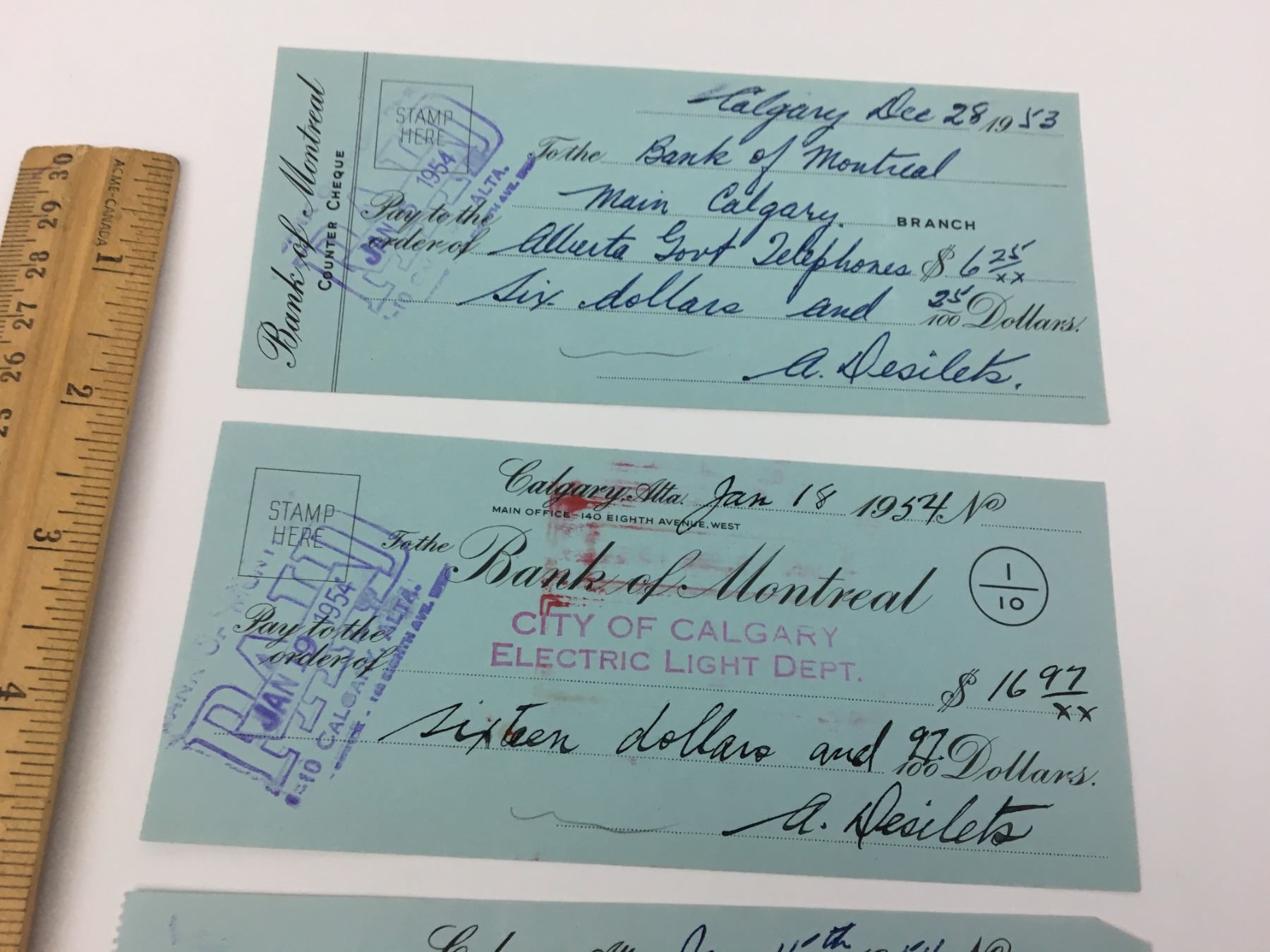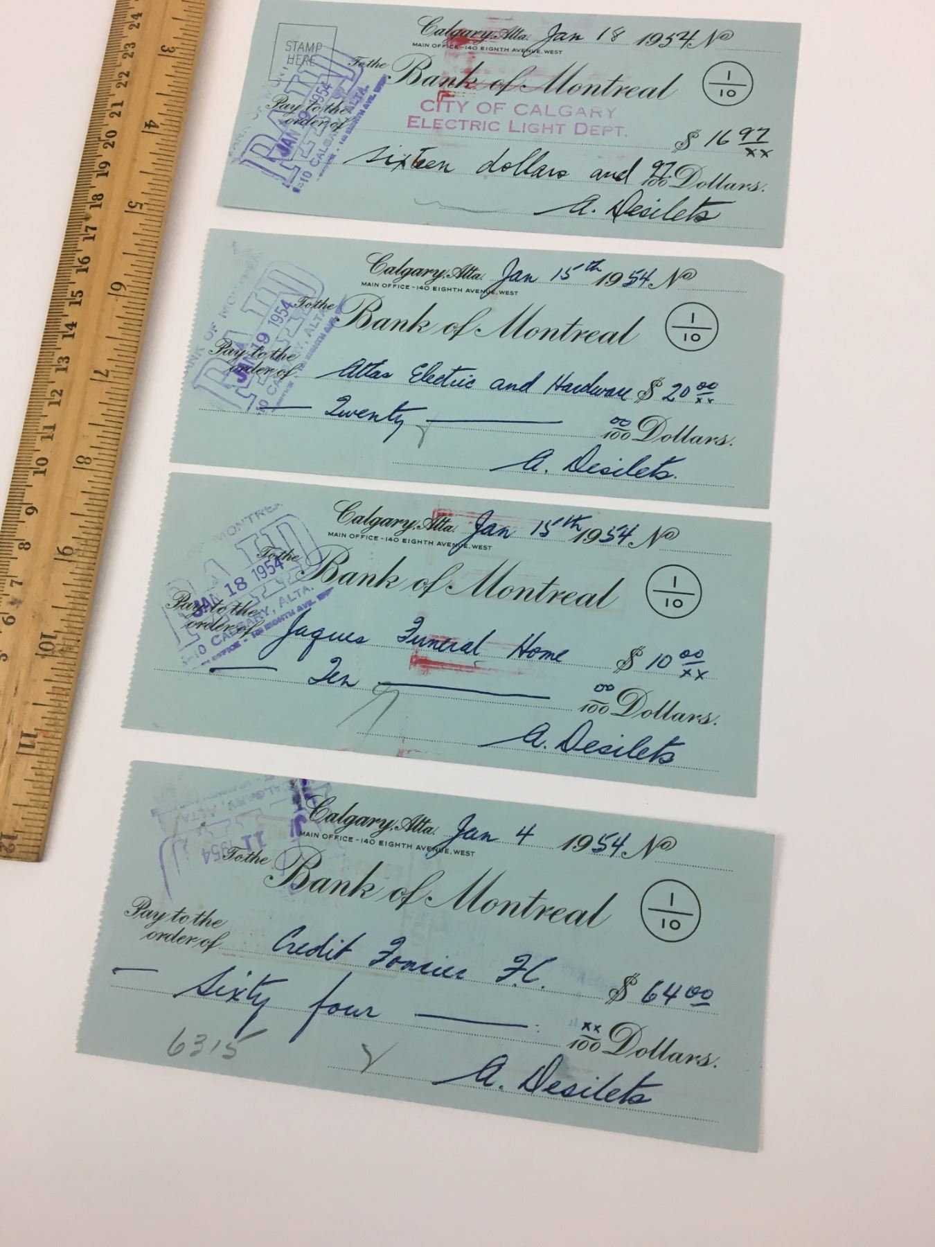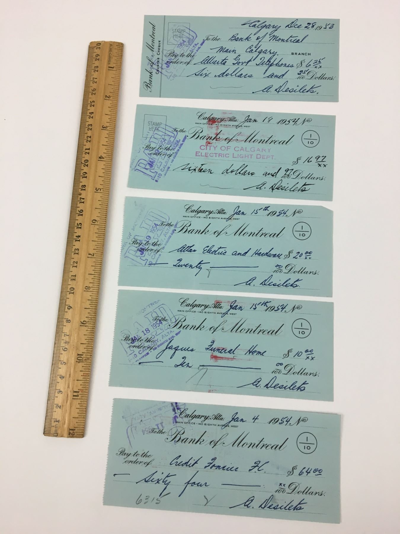 LOT OF 5 BANK OF MONTREAL CHEQUES (1950'S)