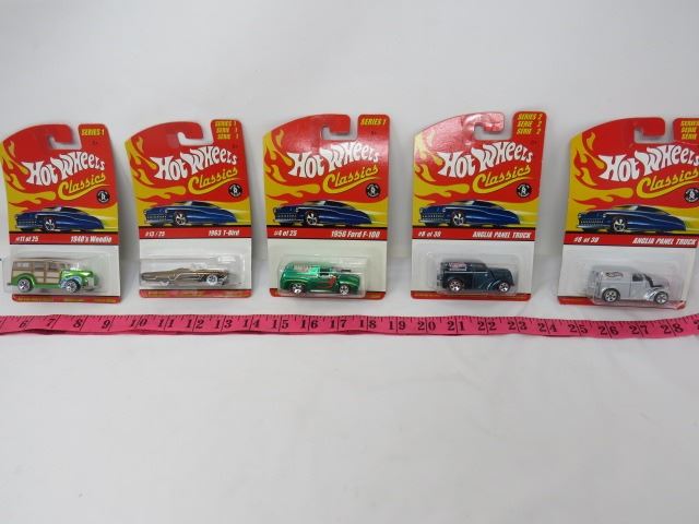 LOT OF 5 HOT WHEELS TOY CARS (1963 T-BIRD, 1940'S WOODIE, 2 X ANGLIA PANEL TRUCK, 1956 FORD F100)