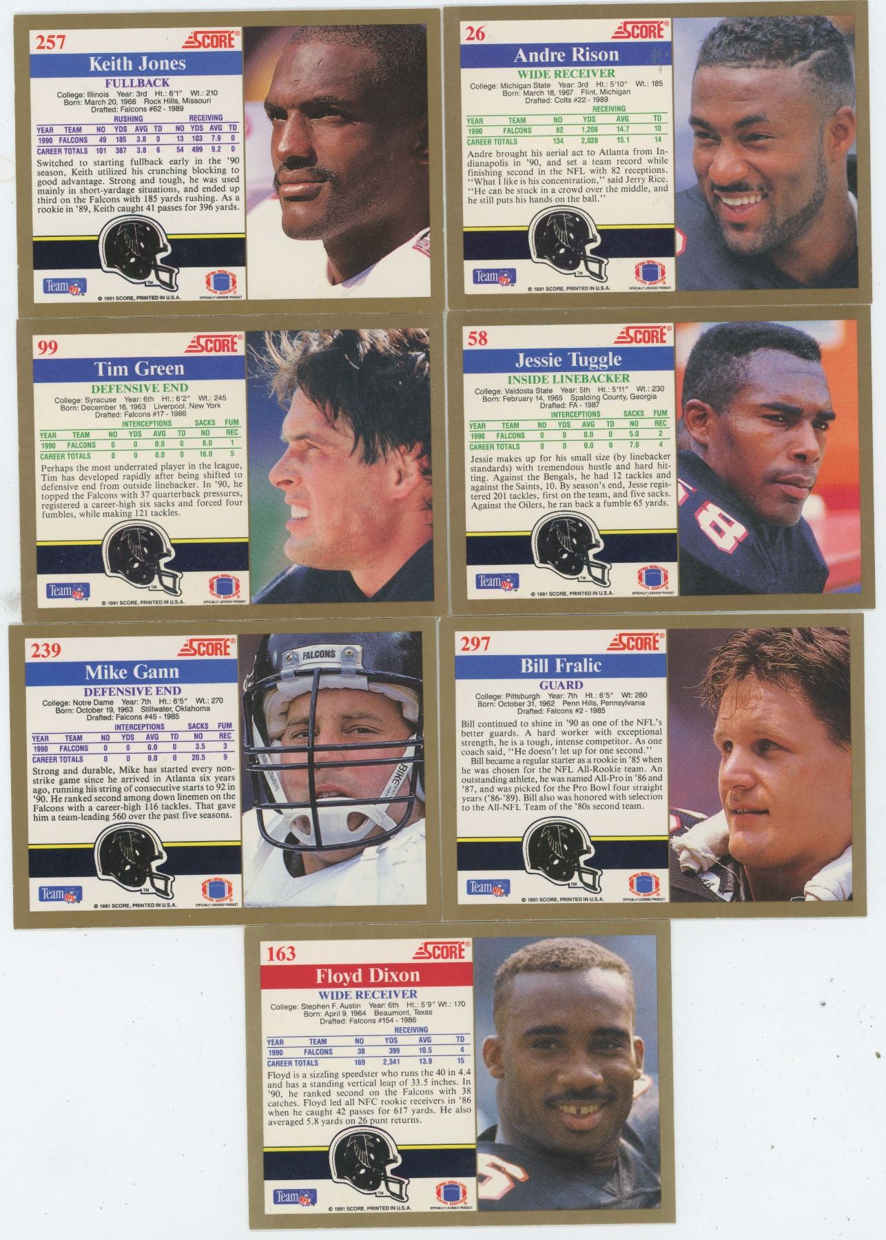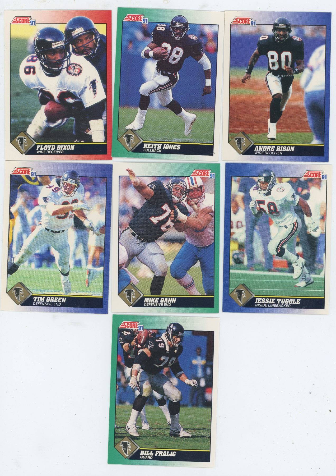 LOT OF 7 ATLANTA FALCONS, NFL FOOTBALL CARDS. INCLUDES ANDRE RISON & KEITH JONES. 1991 SCORE. ALL GEM UNC.