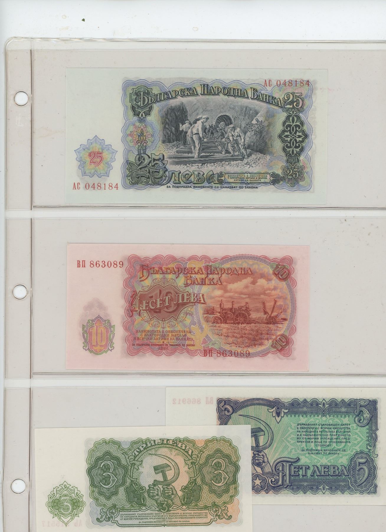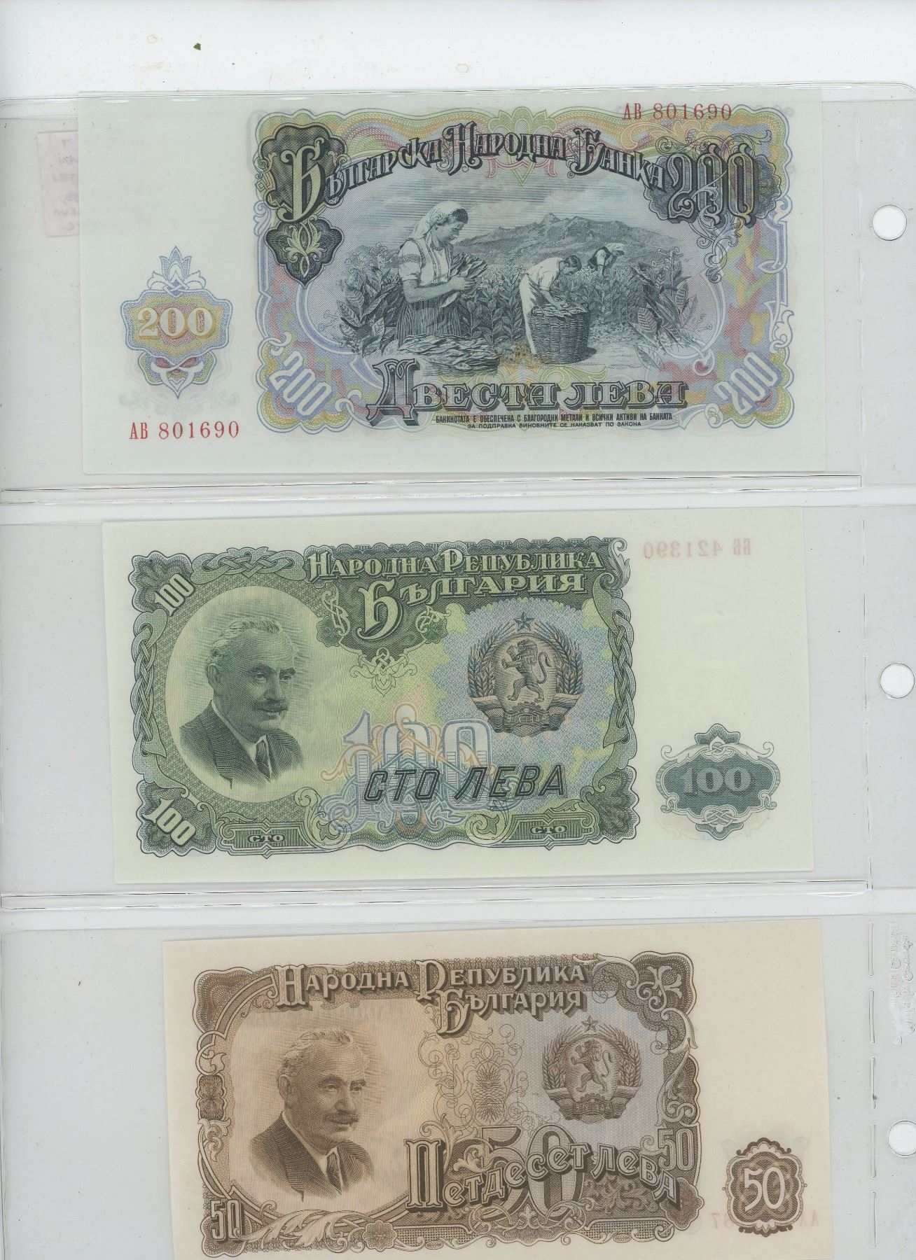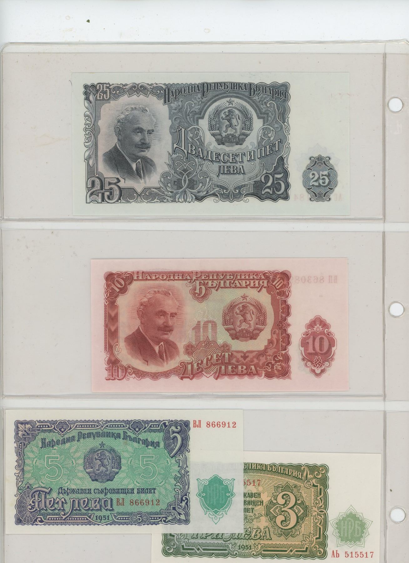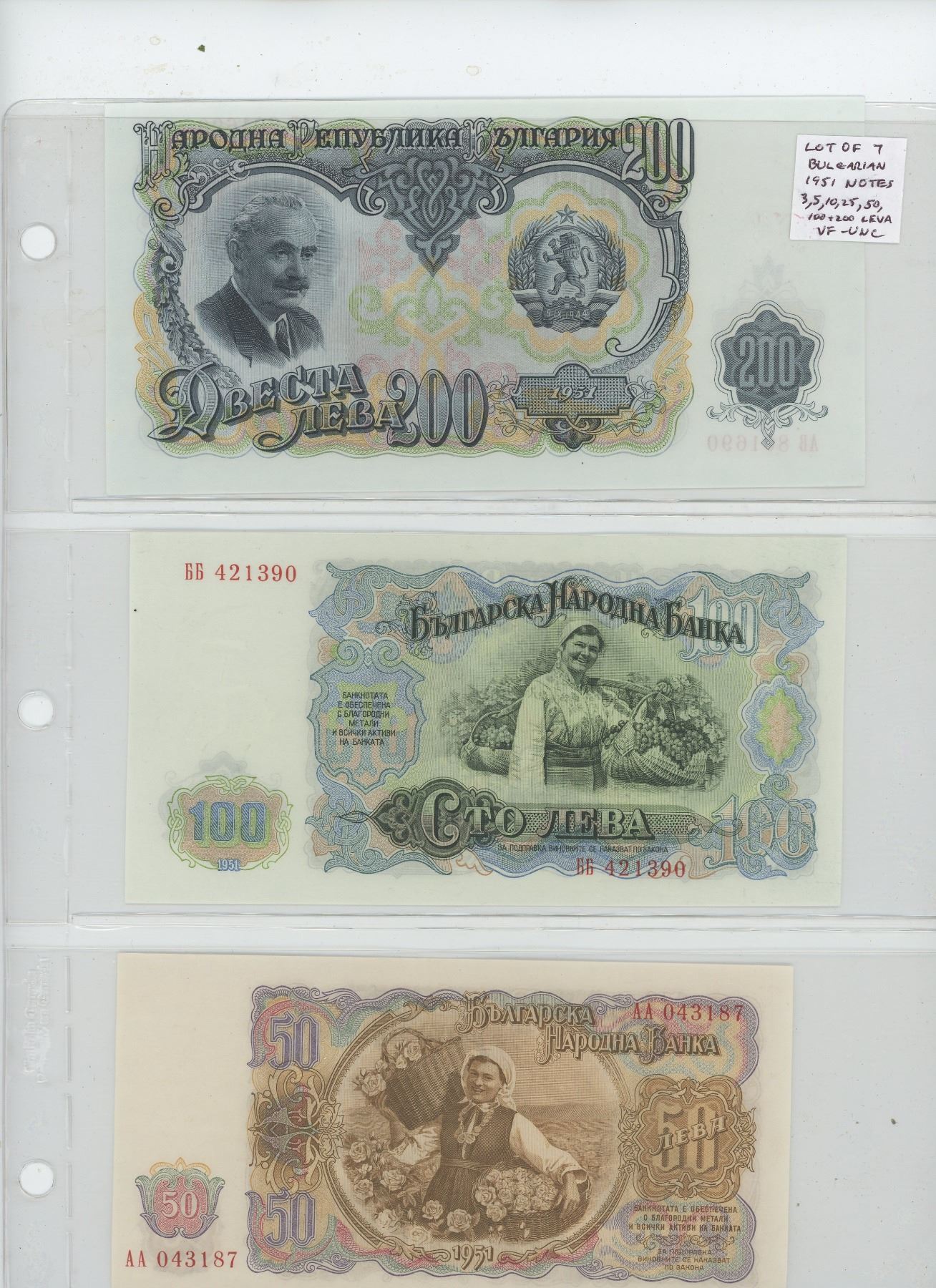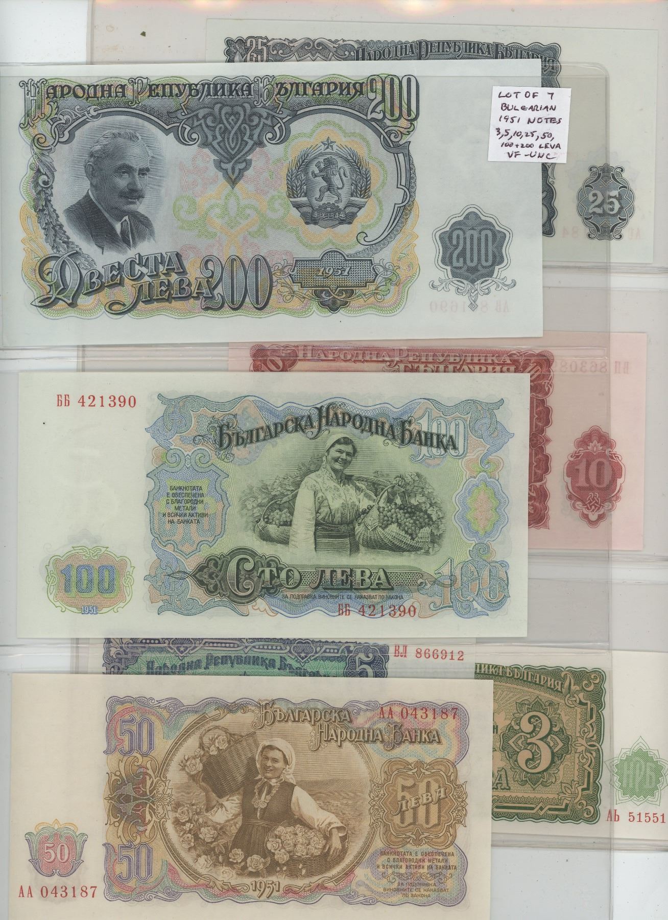 LOT OF 7 DIFFERENT BULGARIAN 1951 NOTES: 3, 5, 10, 25, 50, 100 & 200 LEVA. VF – UNC.