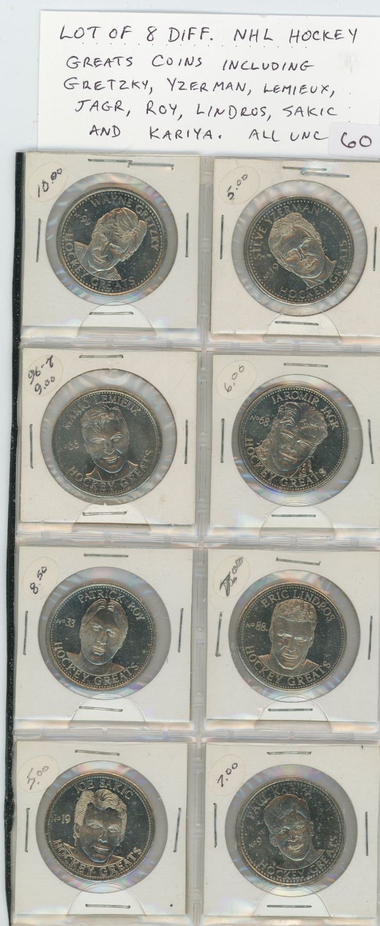 LOT OF 8 DIFFERENT NHL HOCKEY GREATS COINS INCLUDING GRETZKY, YZERMAN, LEMIEUX, JAGR, ROY, LINDROS,