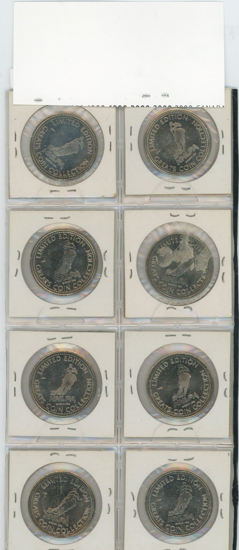 LOT OF 8 DIFFERENT NHL HOCKEY GREATS COINS INCLUDING GRETZKY, YZERMAN, LEMIEUX, JAGR, ROY, LINDROS, SAKIC & KARIYA. ALL UNC.