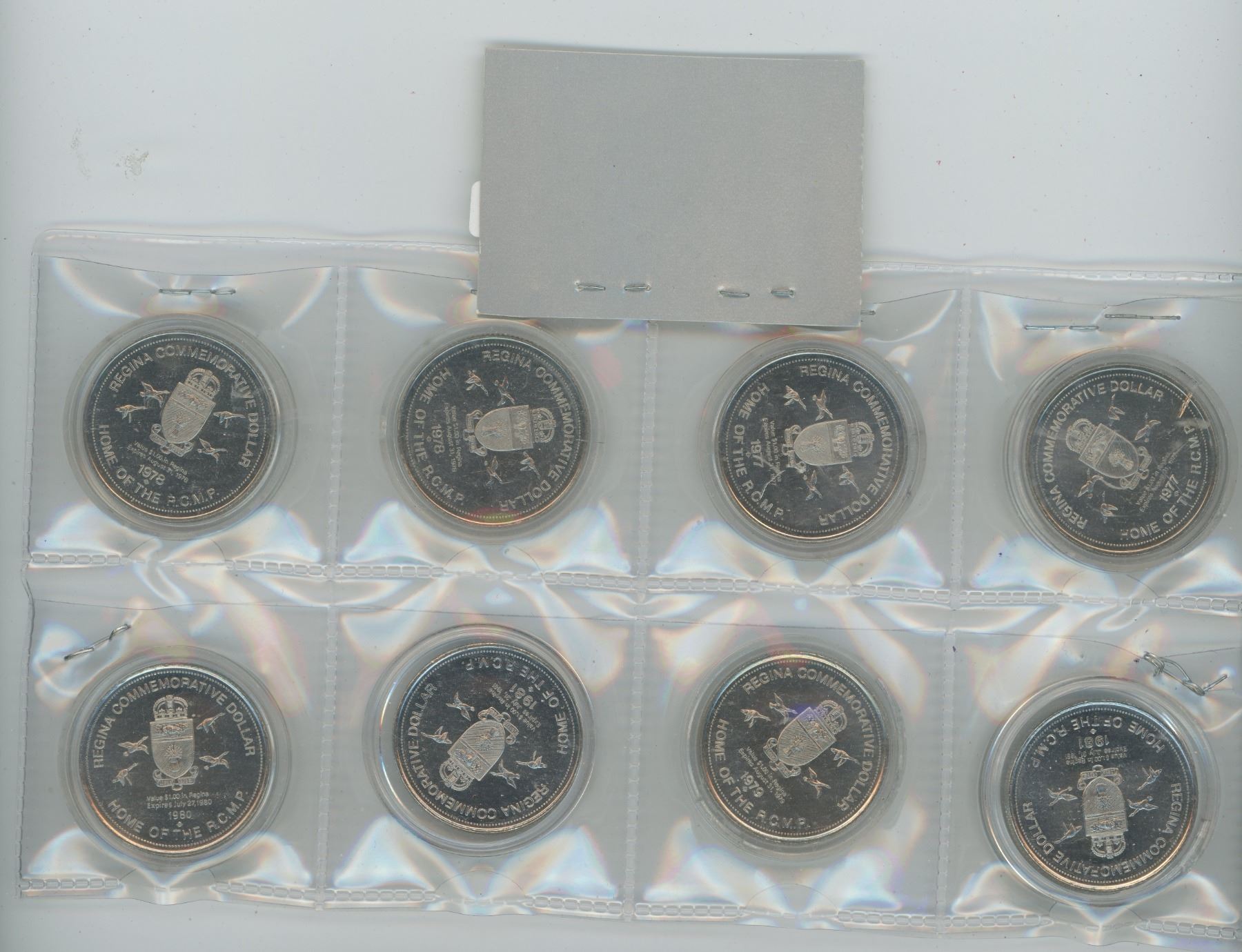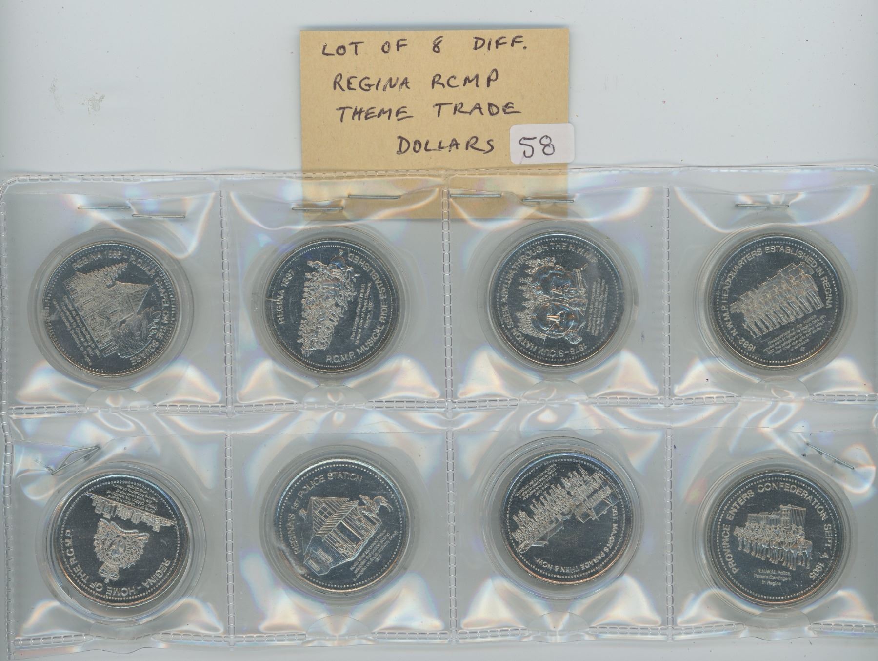 LOT OF 8 DIFFERENT REGINA RCMP-THEME TRADE DOLLARS. INCLUDES SITTING BULL/WALSH AND THE CHARGE OF THE NWMP. ALL UNC.