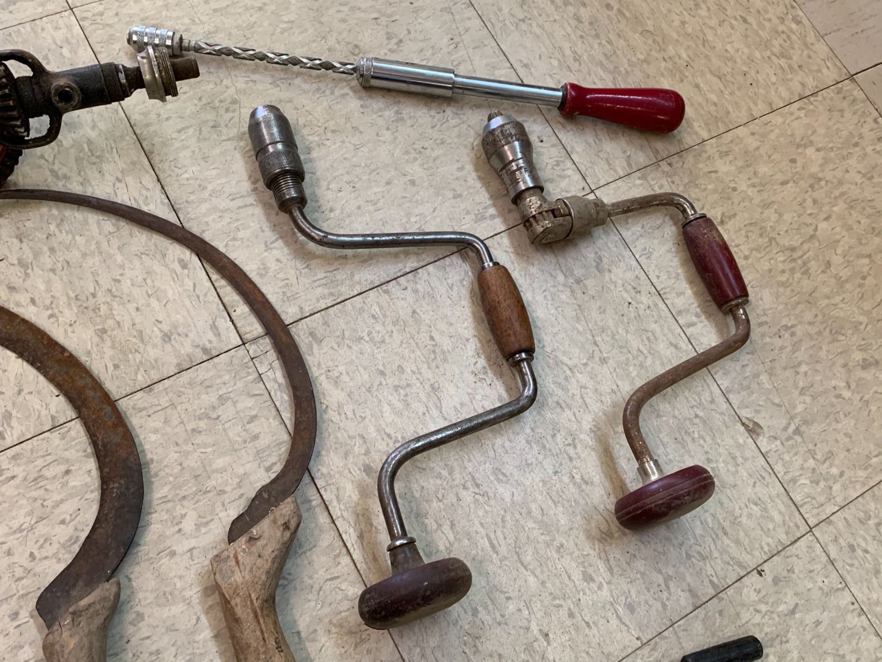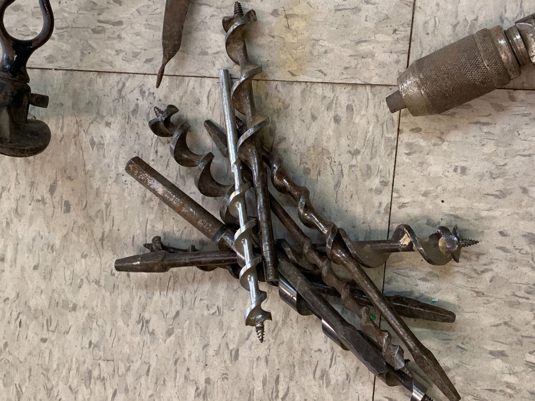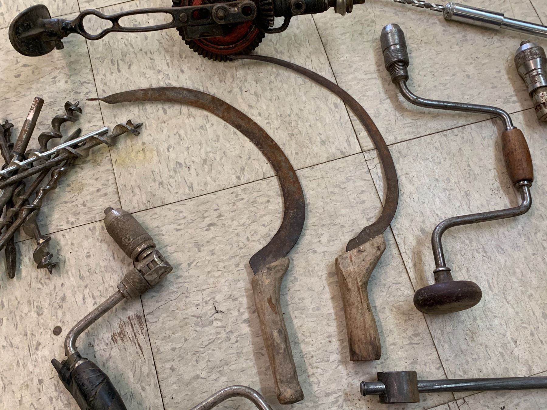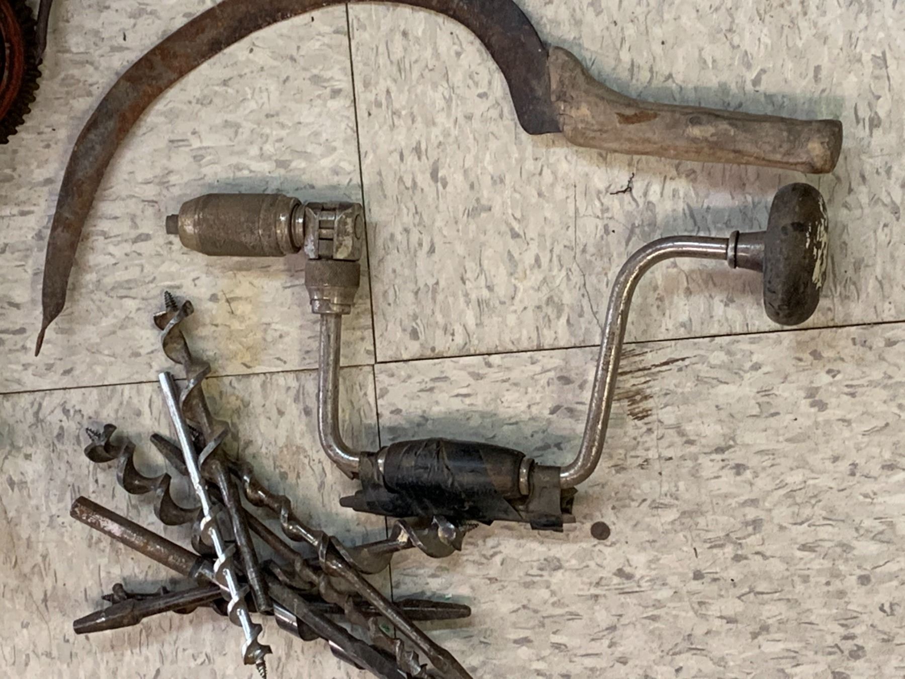 LOT OF ANTIQUE TOOLS DRILLS SICKLES ETC