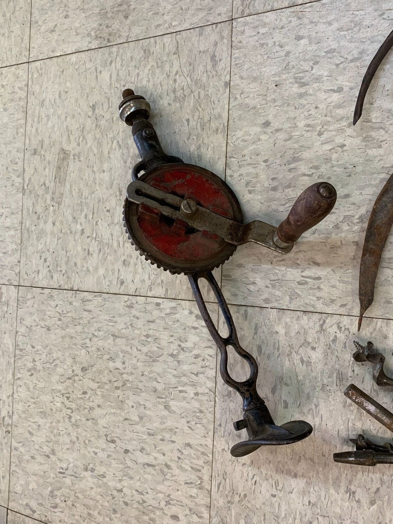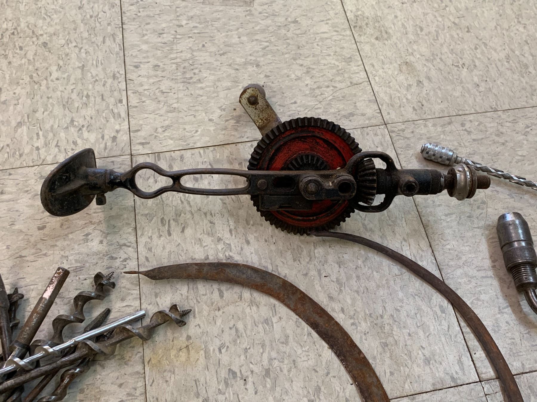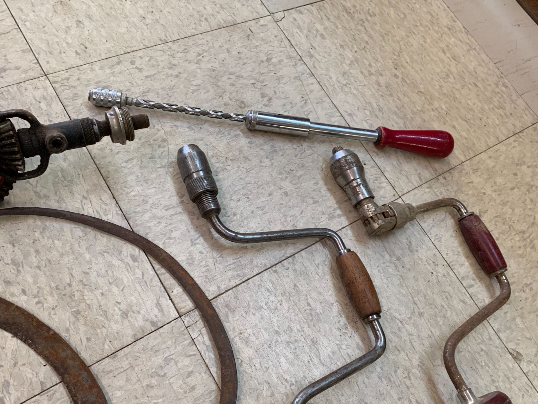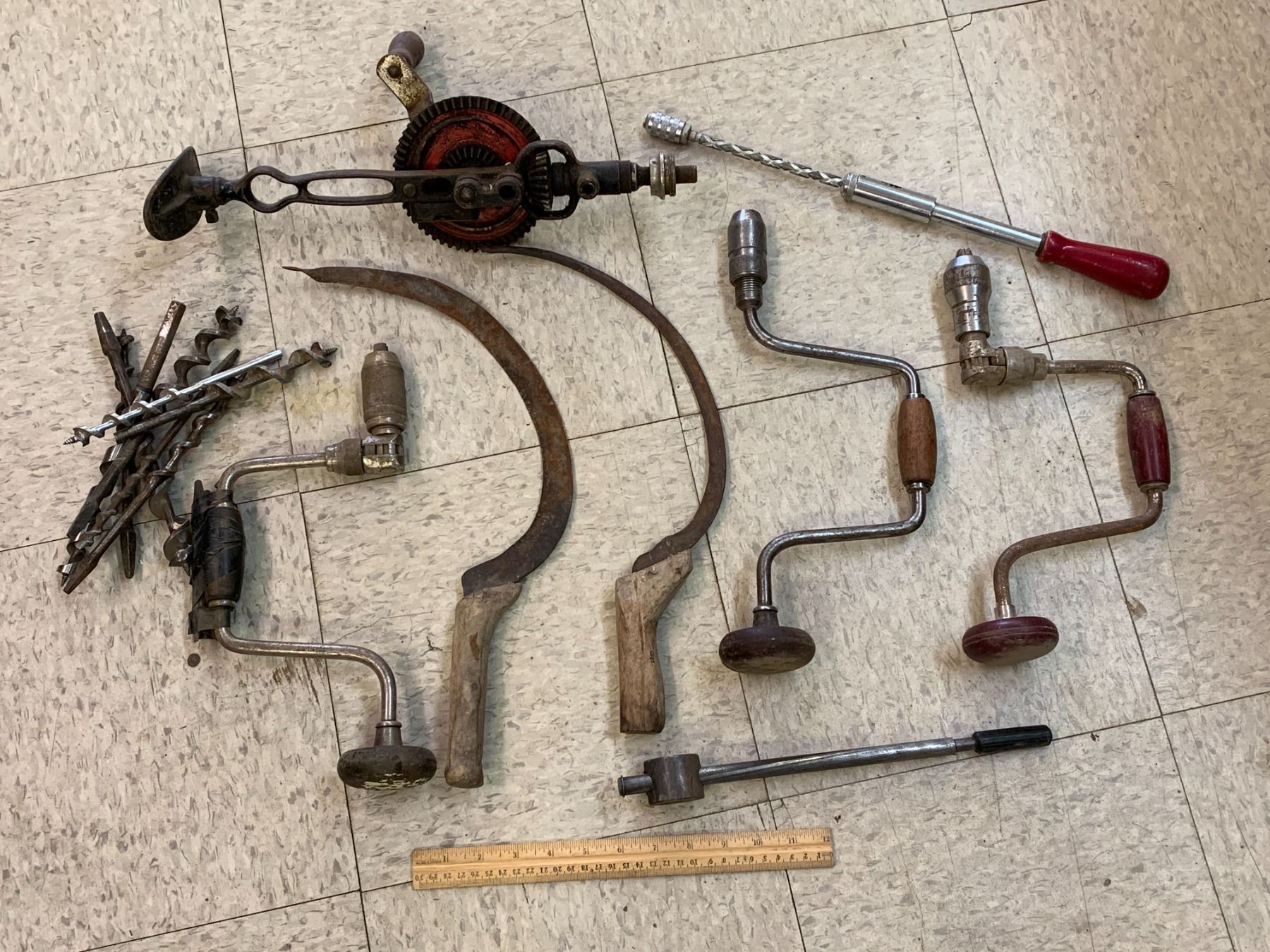 LOT OF ANTIQUE TOOLS DRILLS SICKLES ETC