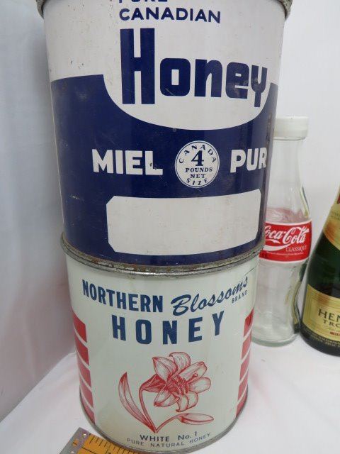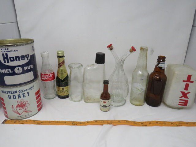 LOT OF ASSORTED GLASS AND TINS (PIC A POP, COCA COLA, MILK CONTAINER ETC...)