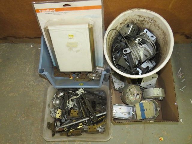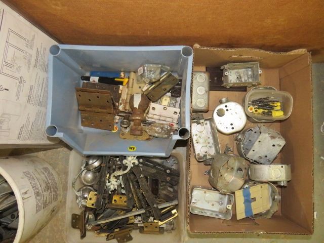 LOT OF ASSORTED HARDWARE - ELECTRICAL BOXES, HINGES, DRAWER PULLS, ETC
