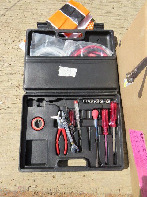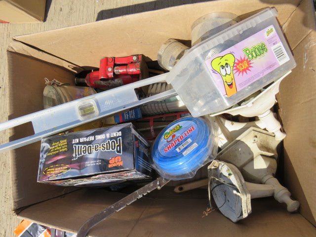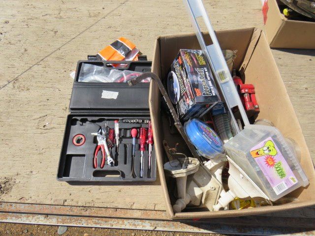 LOT OF ASSORTED ITEMS ( CLAMPS, BOTTLE JACKS, TOOL SET, LEVELS, ETC…)