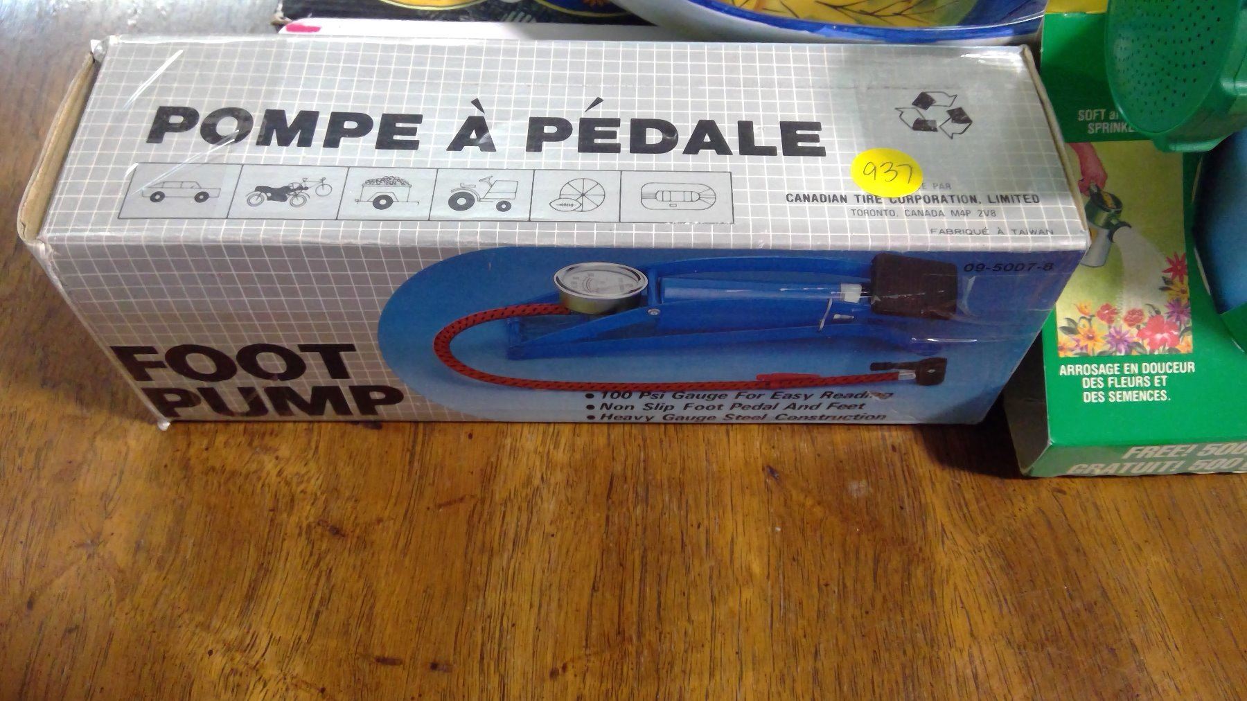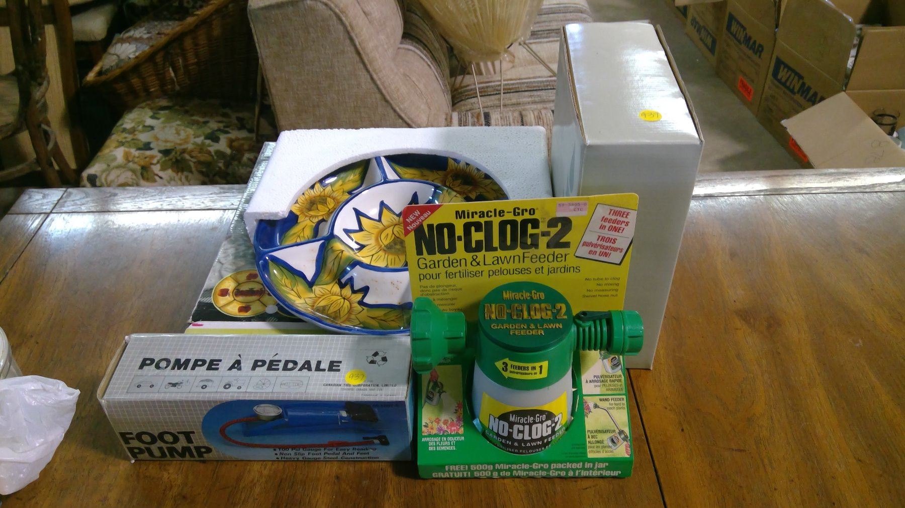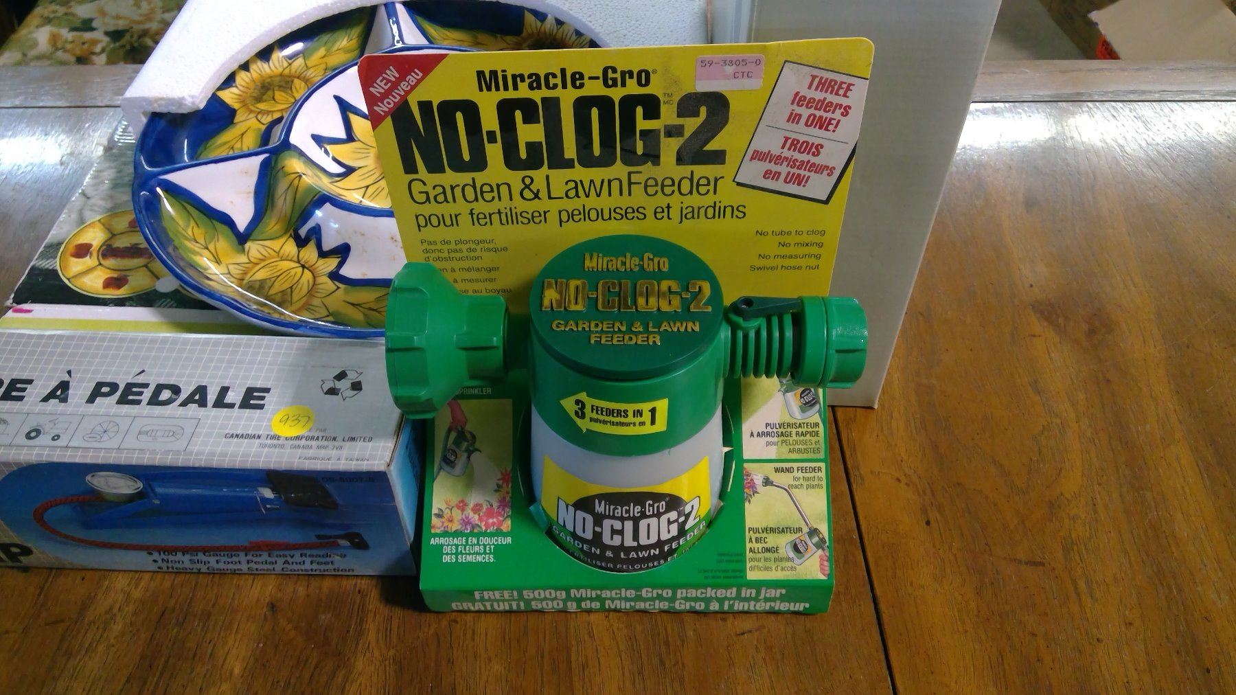 LOT OF ASSORTED ITEMS - LAWN FEEDER, TRAY, FOOT PUMP, ETC.