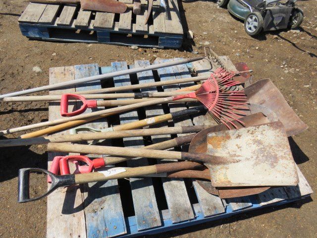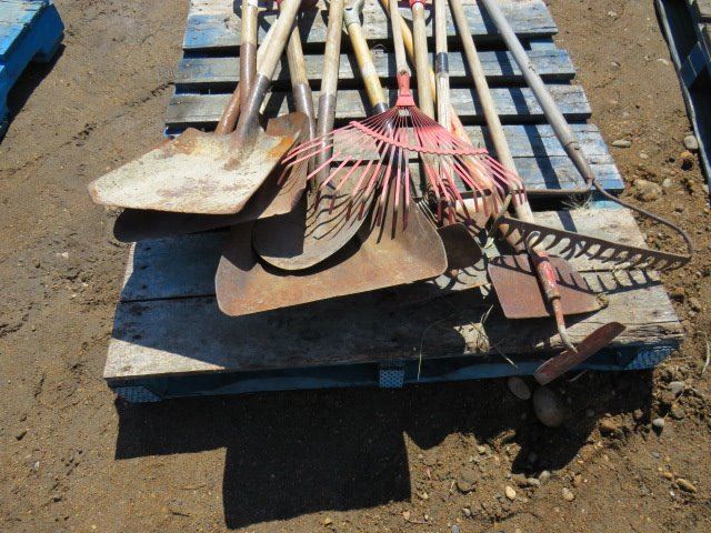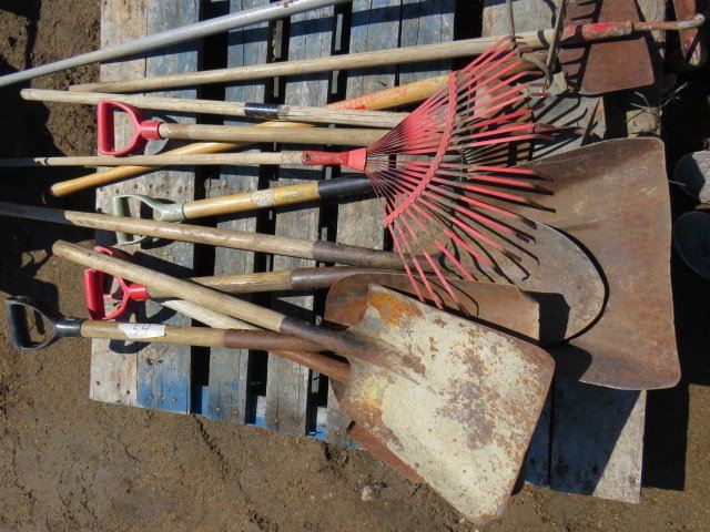 LOT OF ASSORTED SHOVELS, RAKES AND GARDEN TOOLS