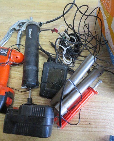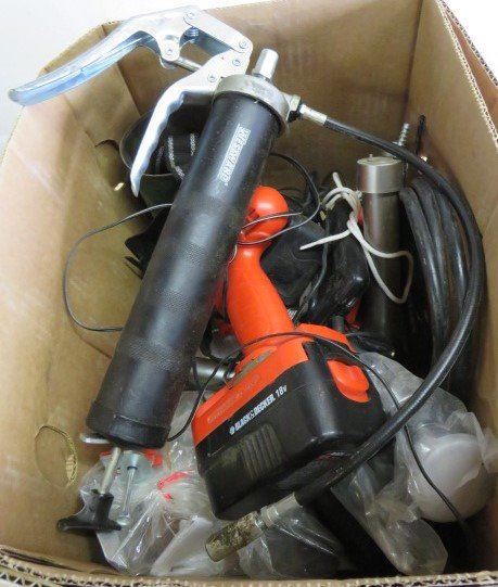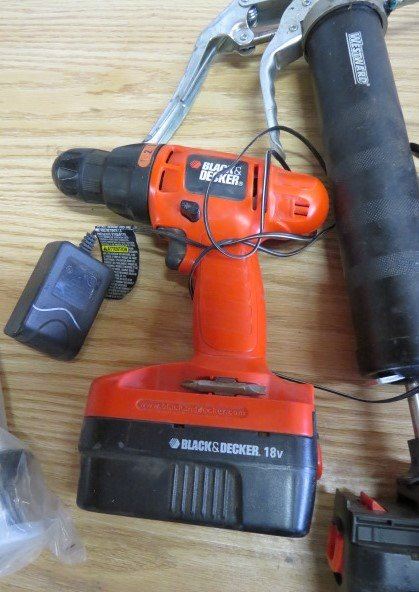 LOT OF ASSORTED TOOLS (18V CORDLESS DRILL- BLACK AND DECKER, GREASE GUN, ETC…)