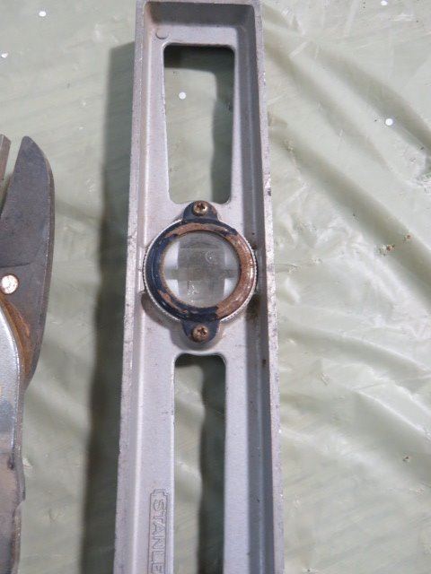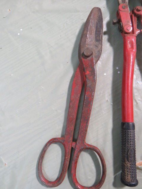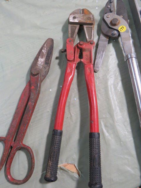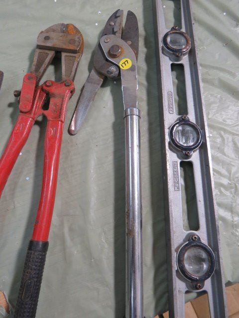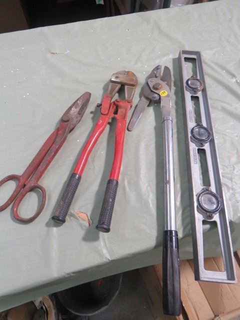 LOT OF ASSORTED TOOLS (BOLT CUTTER, TIN SNIP, LEVEL, ETC…)