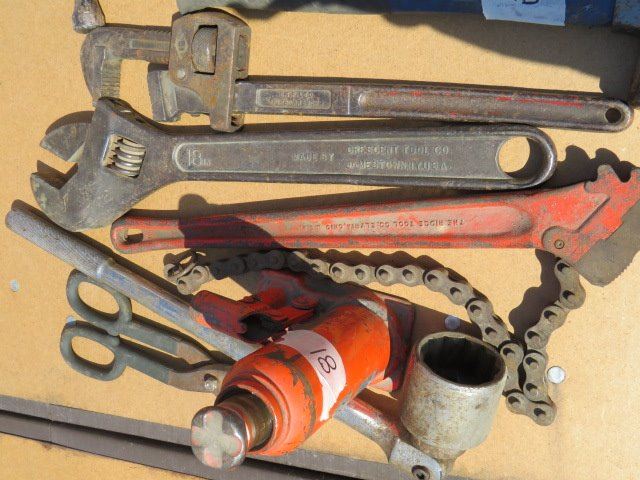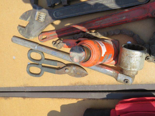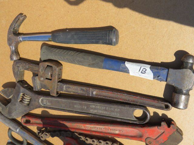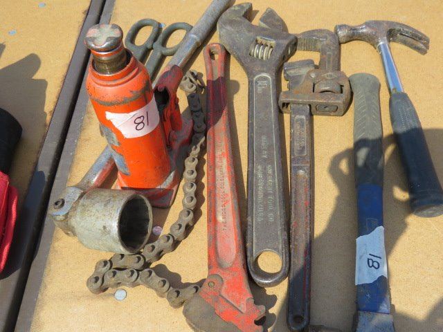 LOT OF ASSORTED TOOLS ( BOTTLE JACK, 18' WRENCH, CRESCENT WRENCHES, PIPE WRENCH, HAMMER, ETC…)