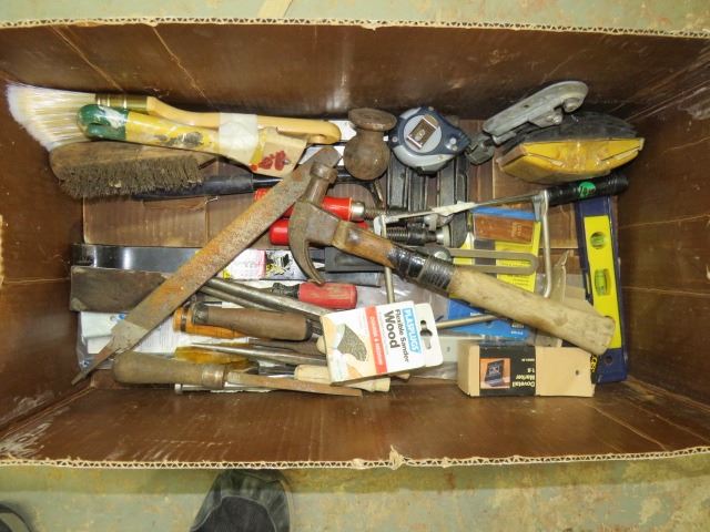 LOT OF ASSORTED TOOLS, BRUSHES, LEVELS, TAPE MEASURE, FILES
