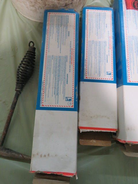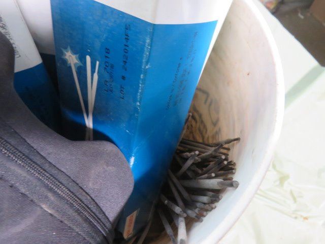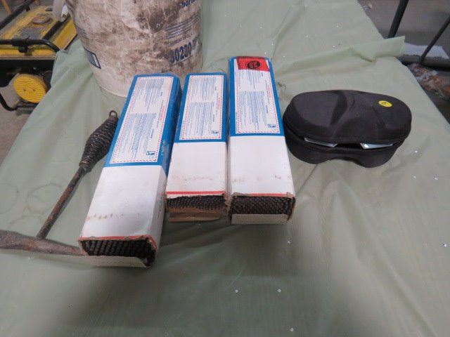 LOT OF ASSORTED WELDING ITEMS ( WELDING RODS, GOGGLES, CHIPPING HAMMER, 7018, 6013, ETC…)