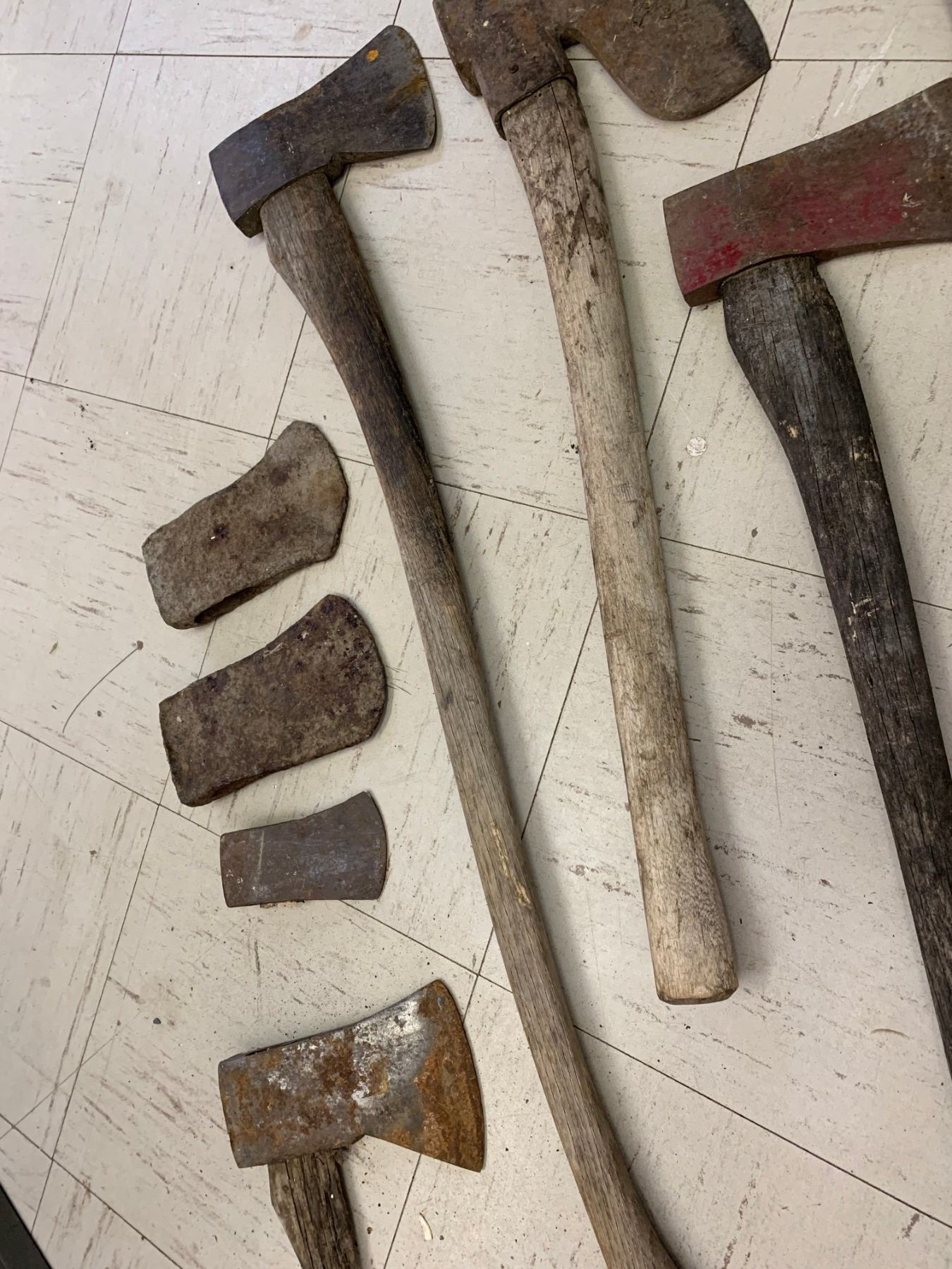 LOT OF AXES AND HEADS INCLUDING A DOUBLE AX HEAD
