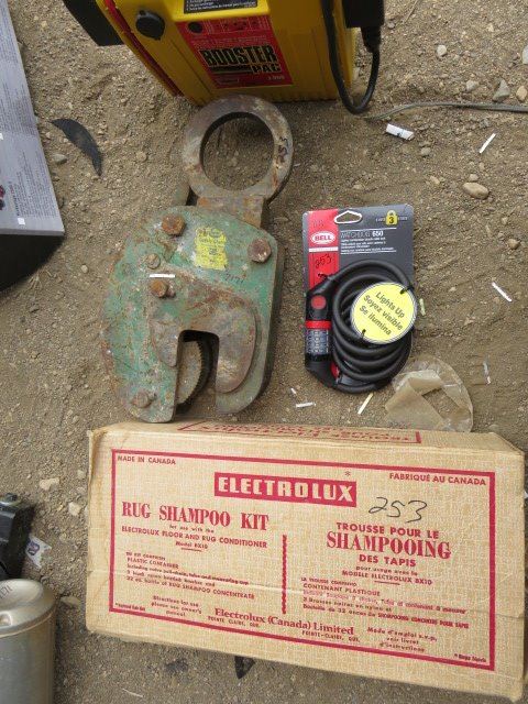 LOT OF BATTERY BOOSTER, 'BELL' LOCK, ELECTROLUX RUG SHAMPOO KIT, SNATCH BLOCK CLAMP
