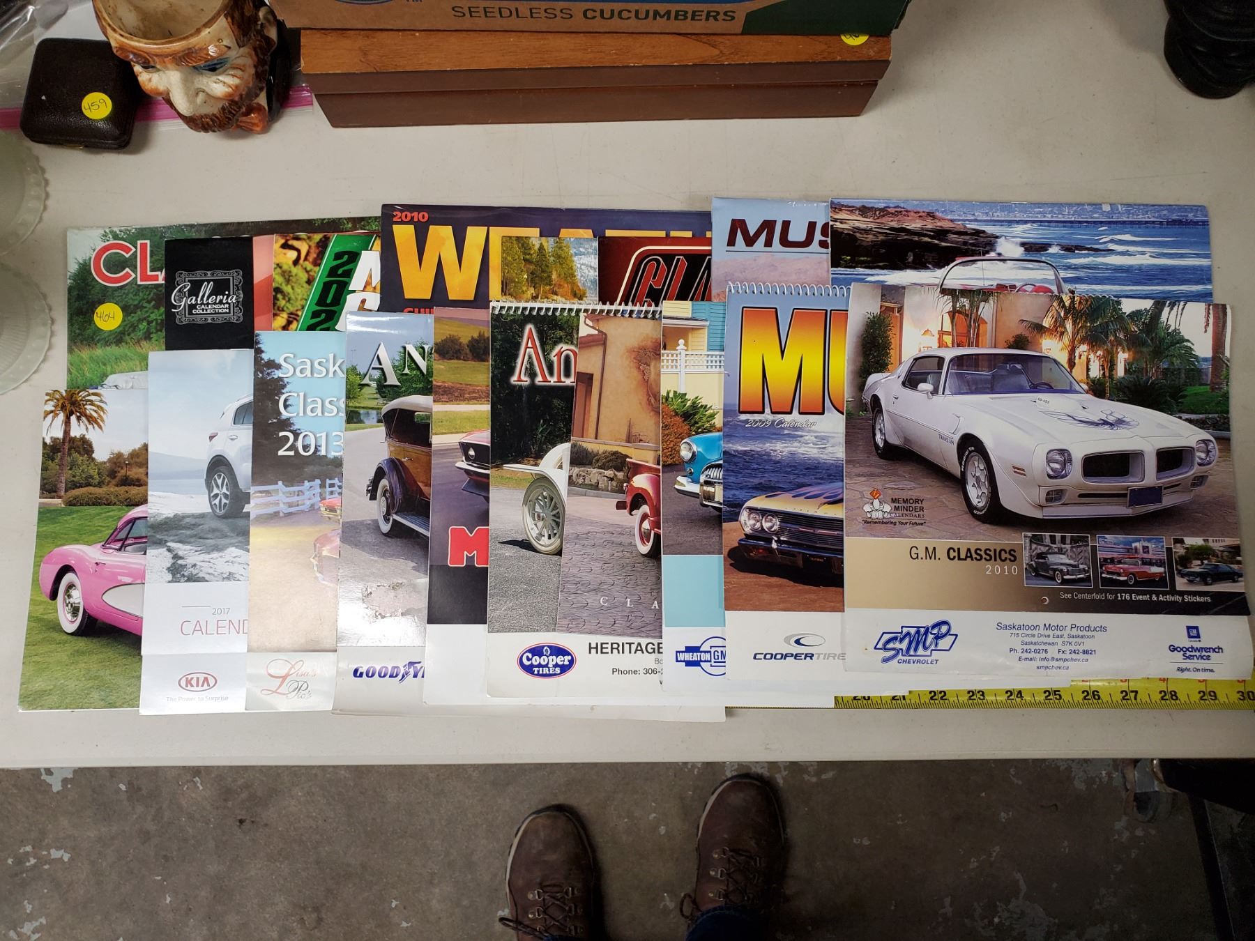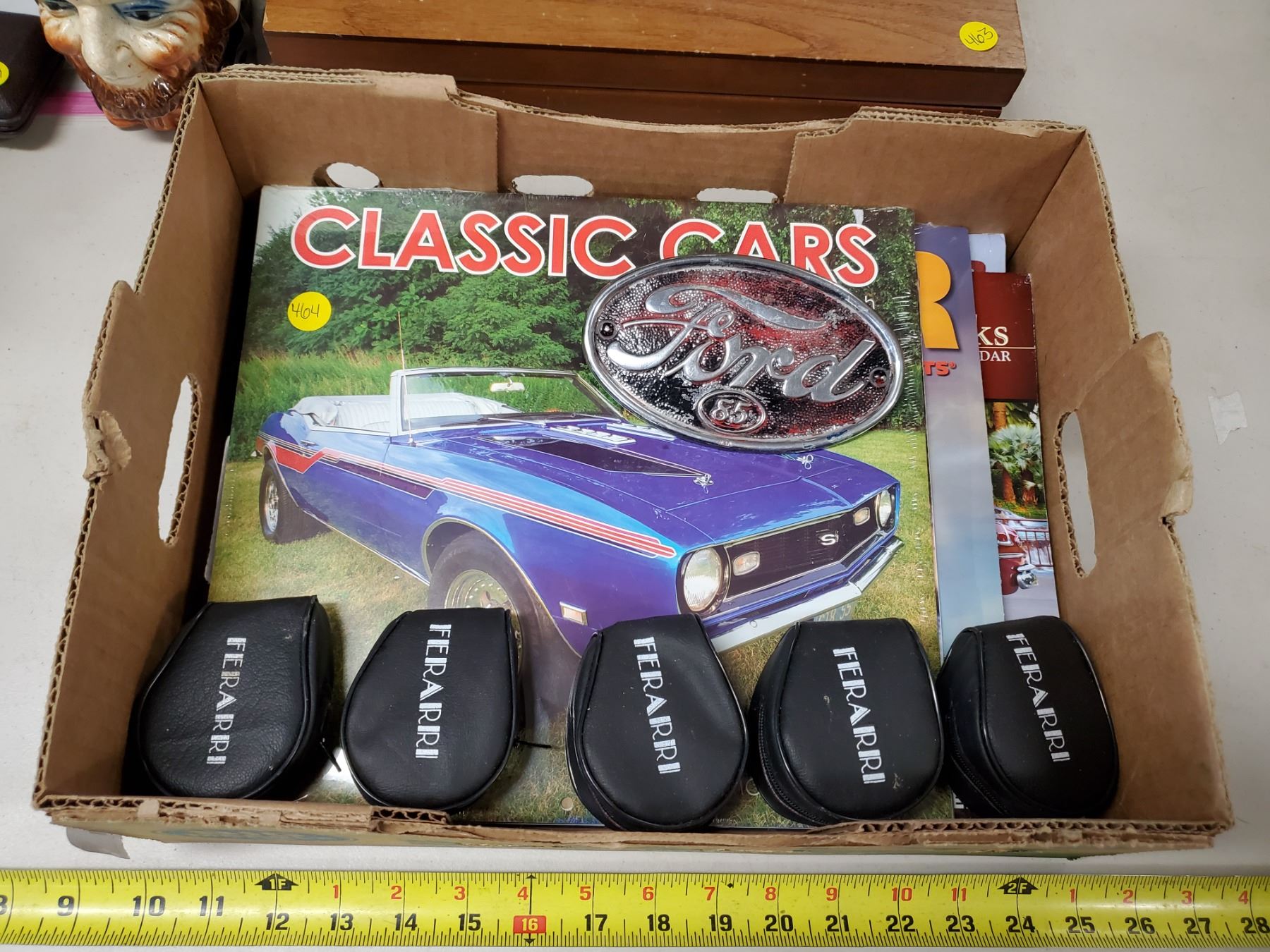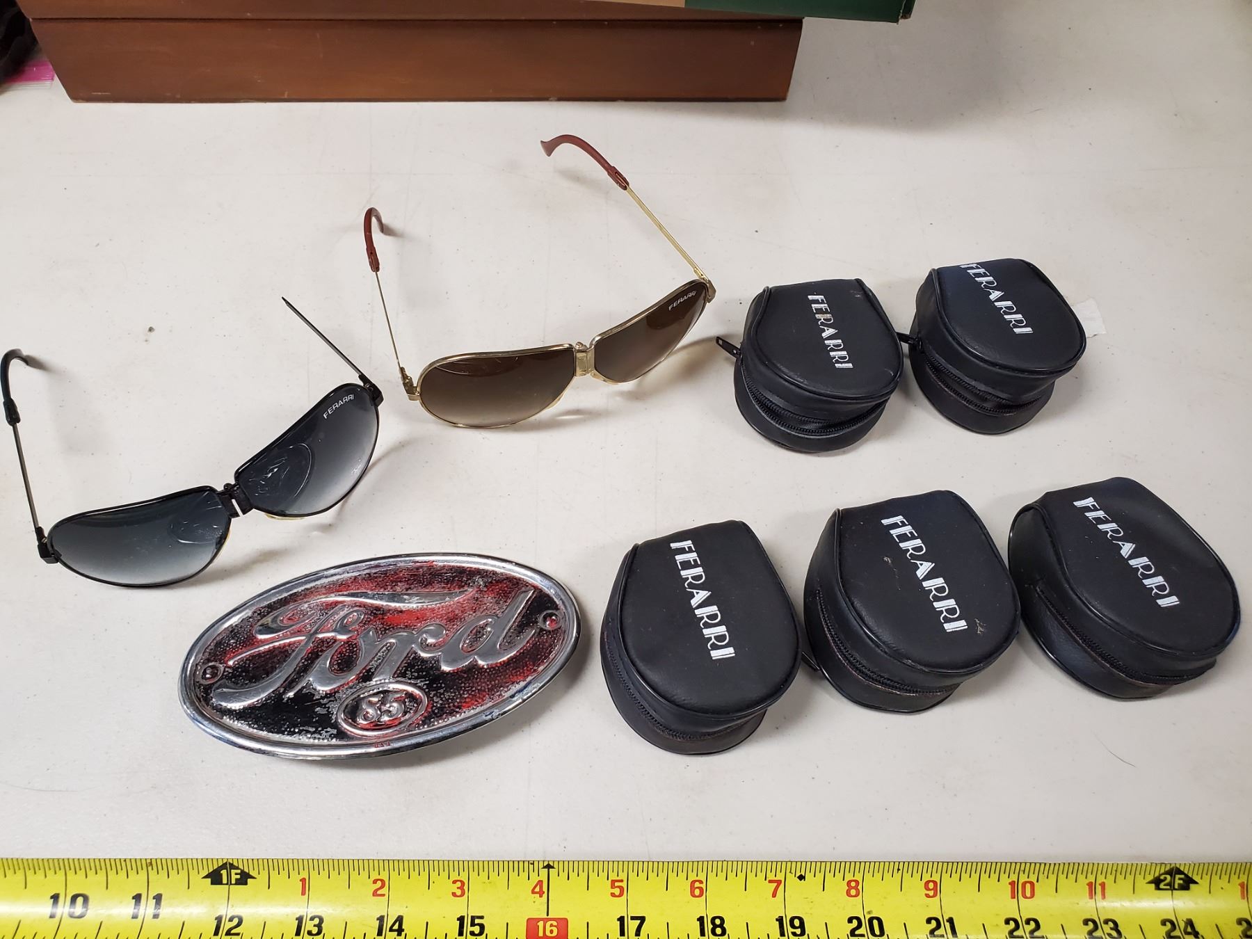 LOT OF CAR CALENDARS, SUNGLASSES, FORD EMBLEM