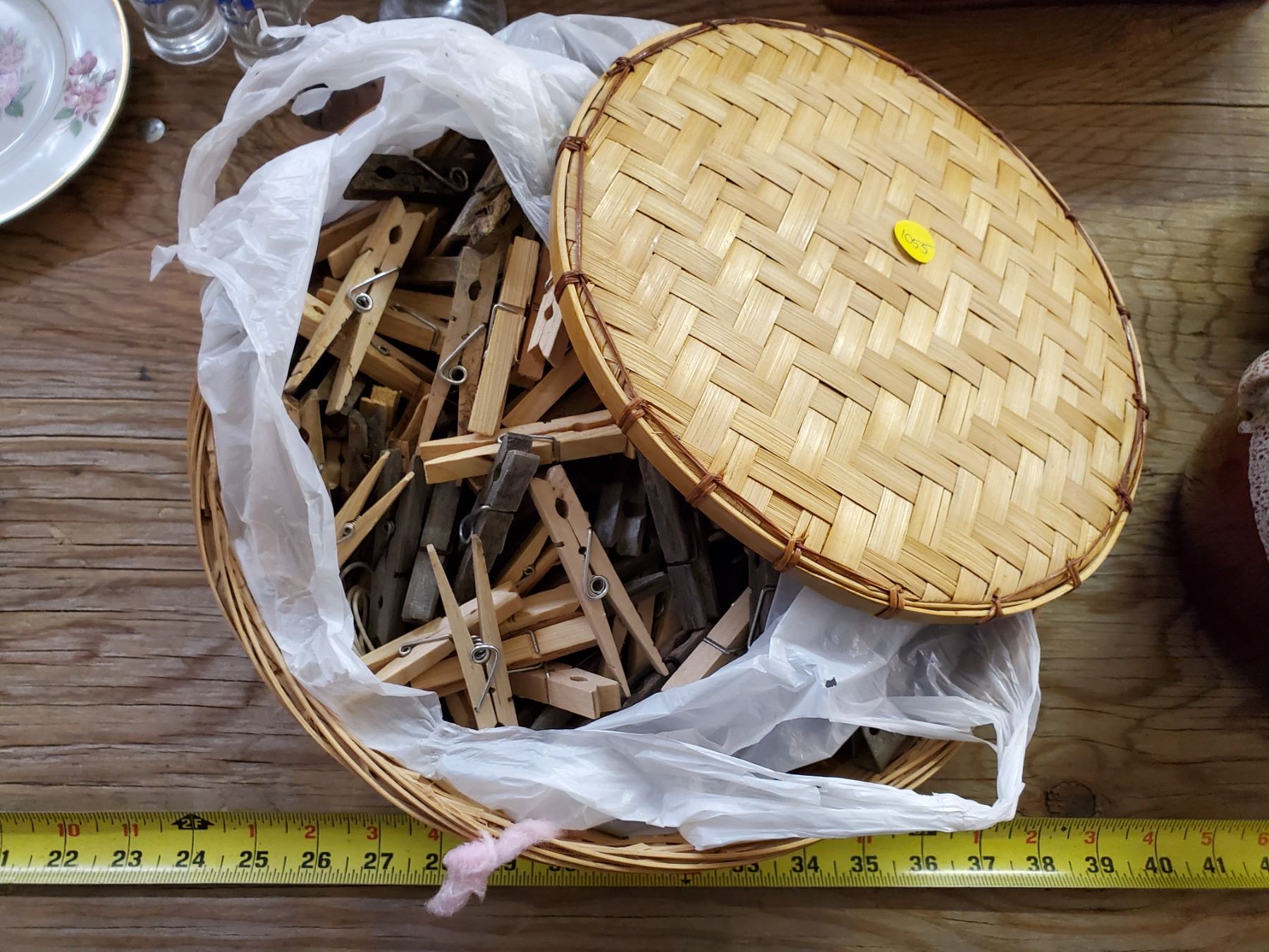 LOT OF CLOTHESPINS IN WICKER BASKET