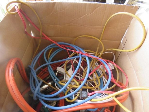 LOT OF ELECTRICAL ITEMS (BOOSTER CABLES, ELECTRICAL CORDS, FAN, FLASHLIGHTS, ETC)