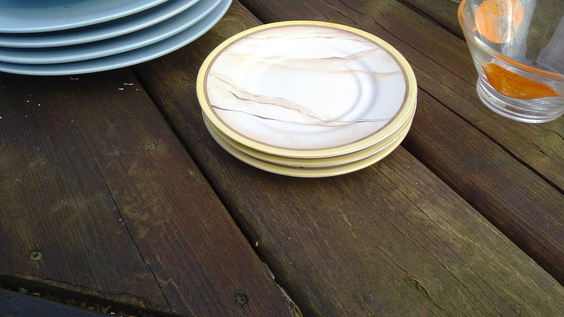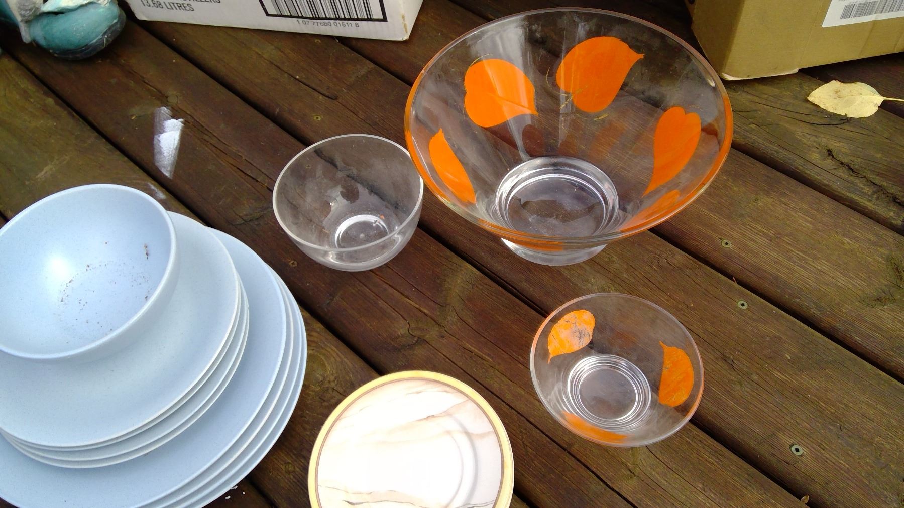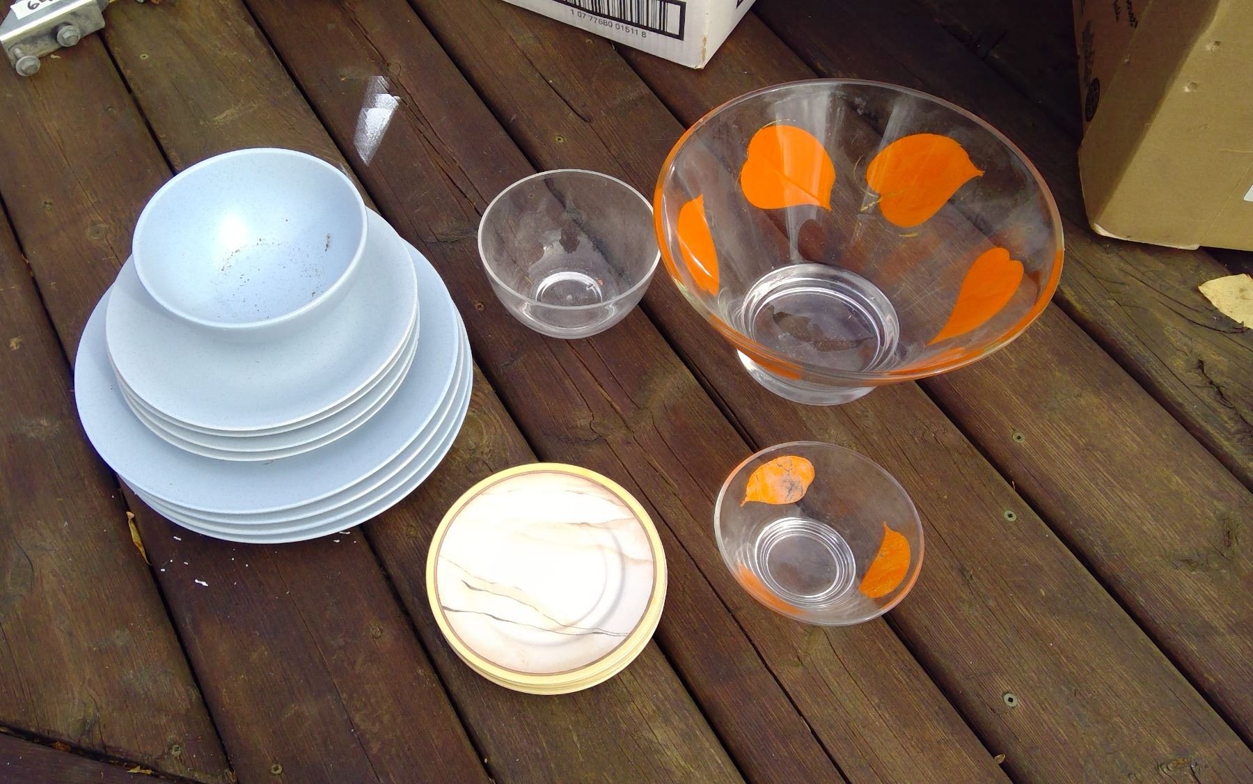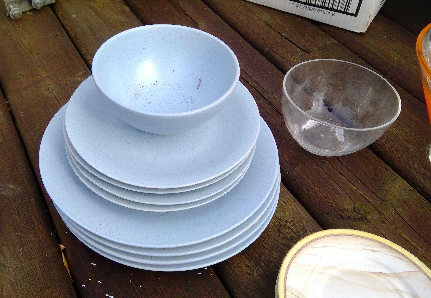 8 MATCHING PLATES OF TWO SIZES AND ONE MATCHING BOWL, INCLUDES 2 MATCHING BOWLS AND ONE PLASTIC BOWL