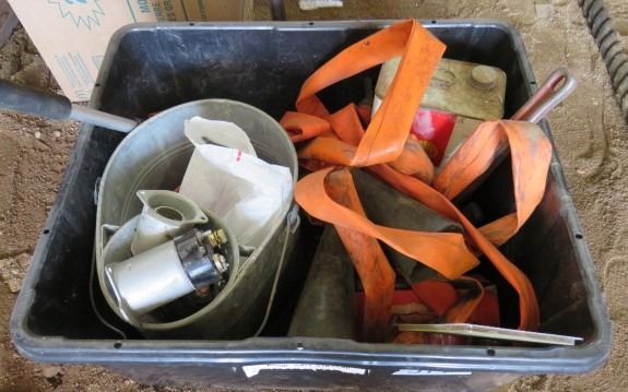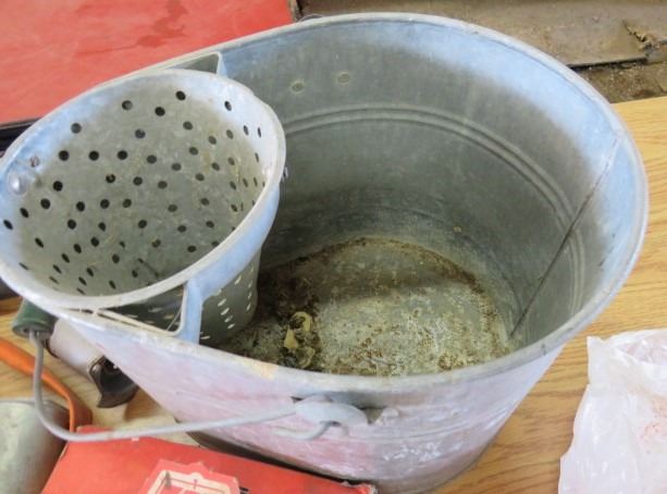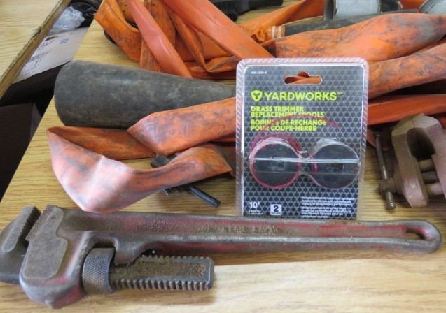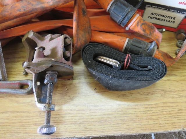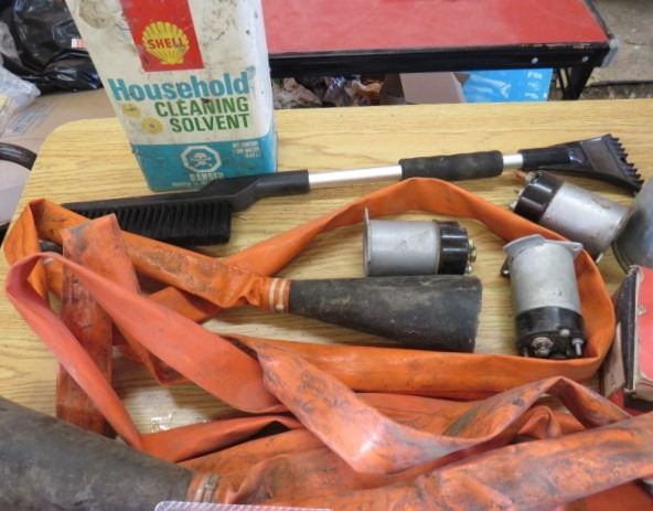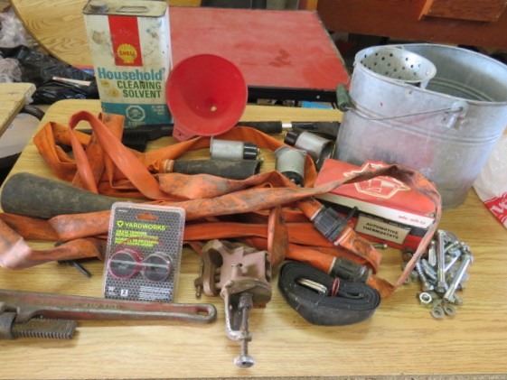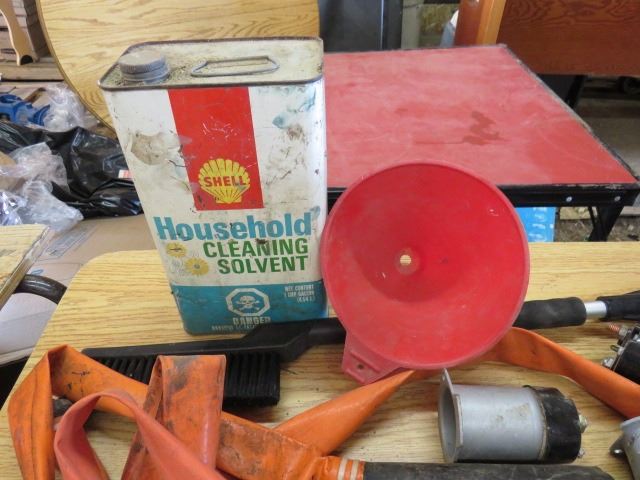 LOT OF MISC HOUSEHOLD ITEMS (SHELL HOUSEHOLD CLEANER SOLVENT, MOP PAIL, WINDSHIELD BRUSH, ETC)