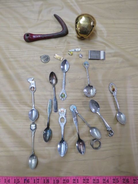 LOT OF MISCELLANEOUS ITEMS (SPOONS, BELL, ETC.)