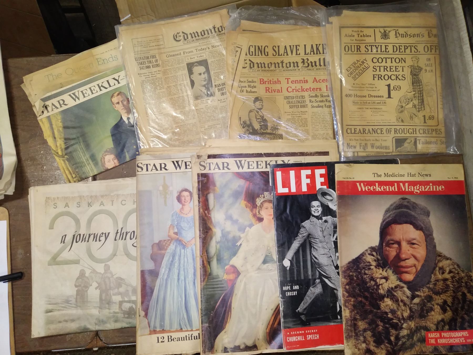 LOT OF OLD NEWSPAPERS & MAGAZINES ( STAR WEEKLY, HBC, EDMONTON JOURNAL, ETC)