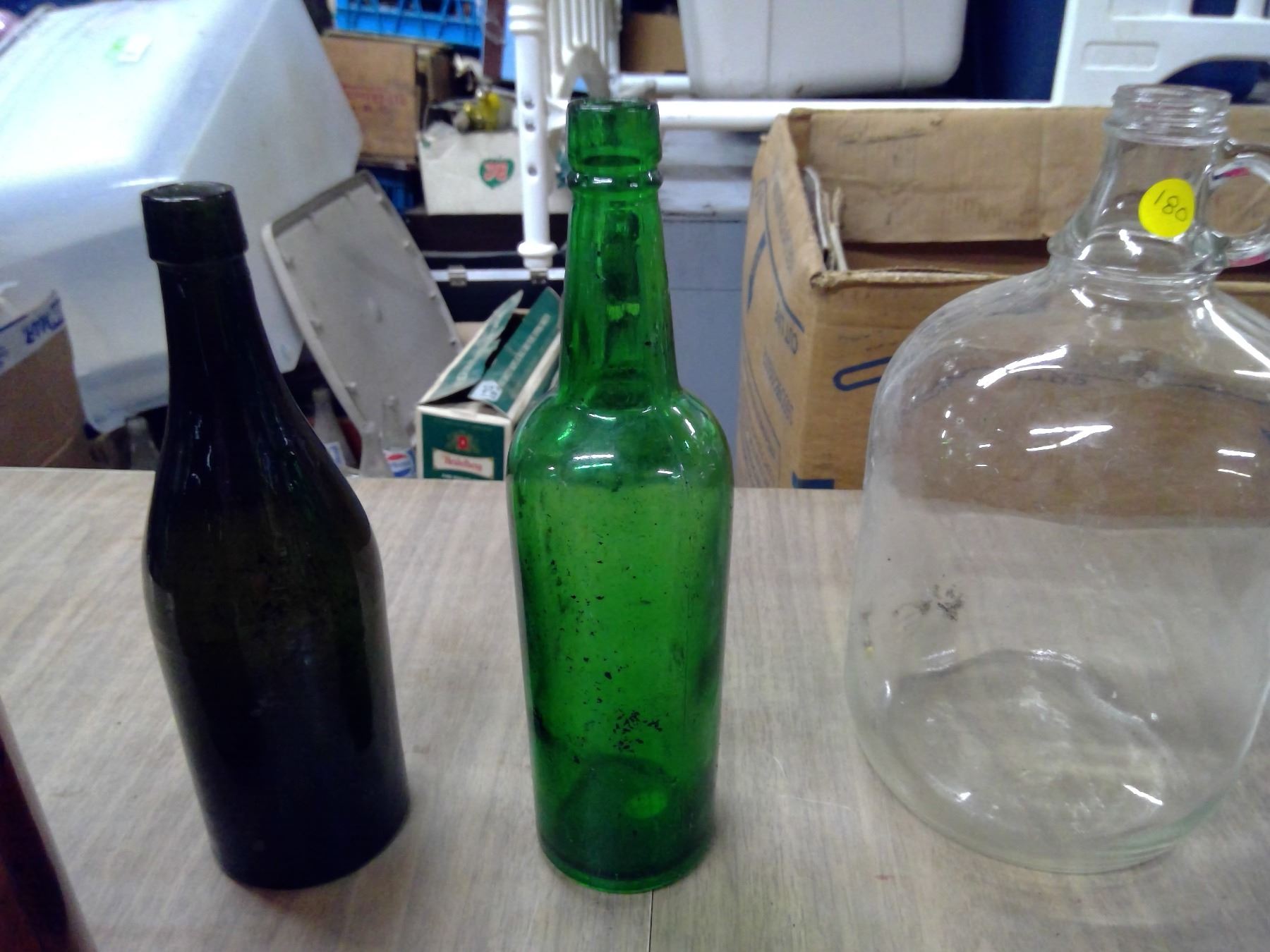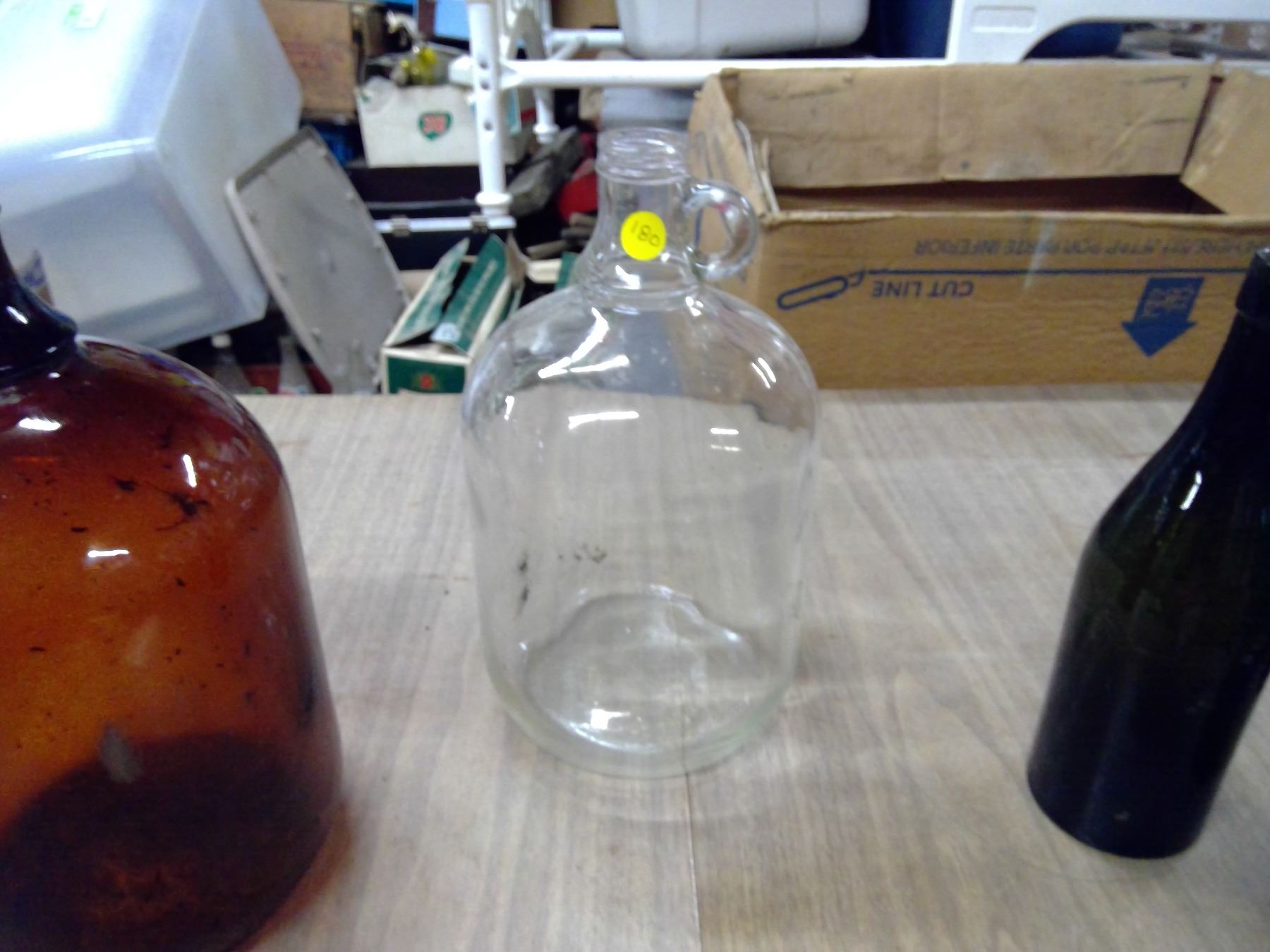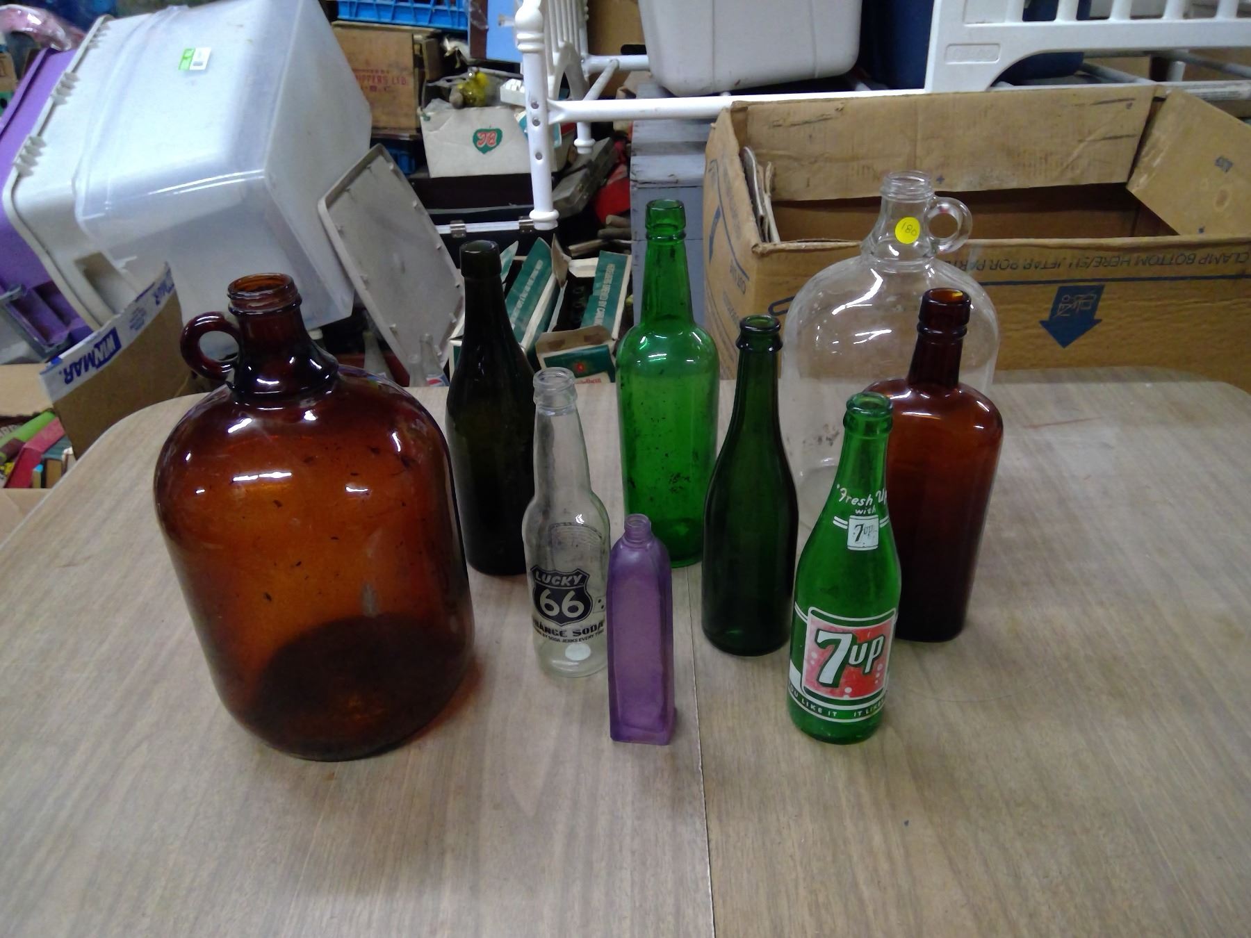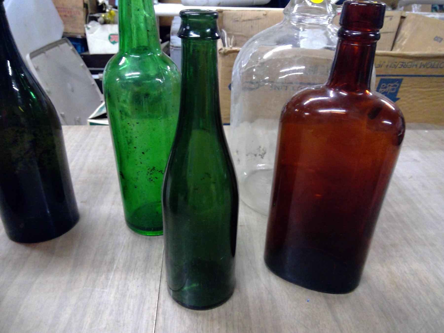 LOT OF RED BOTTLES AND GLASS JUGS