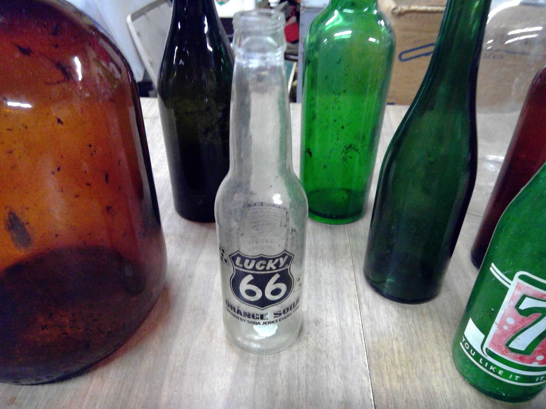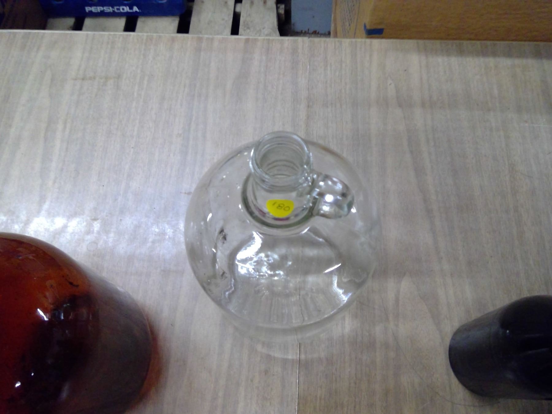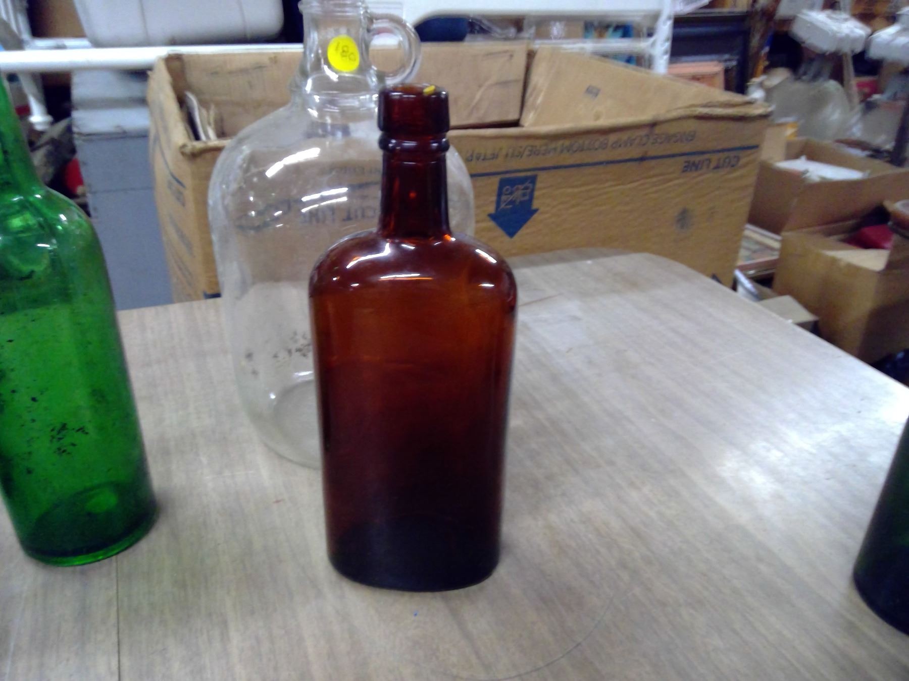 LOT OF RED BOTTLES AND GLASS JUGS