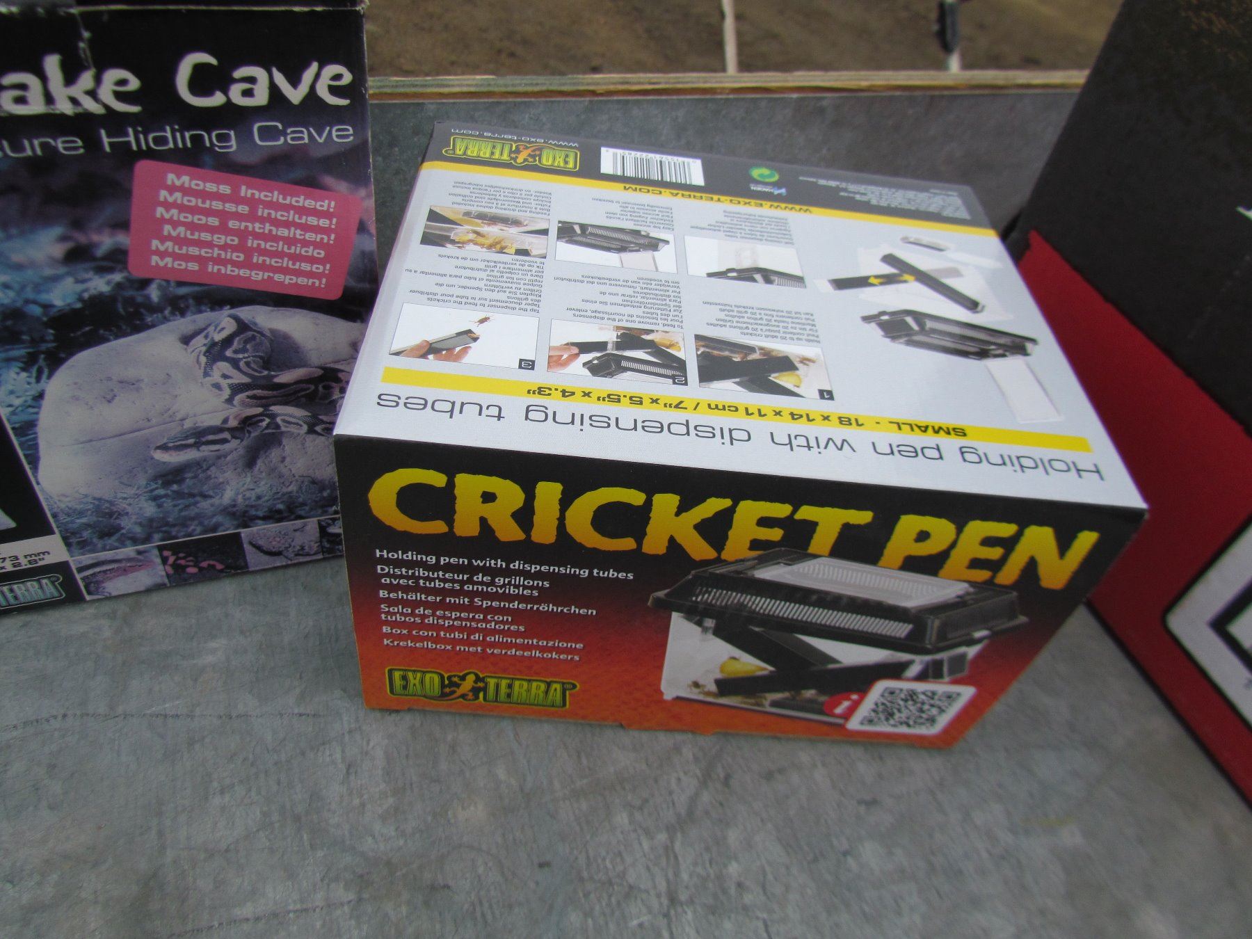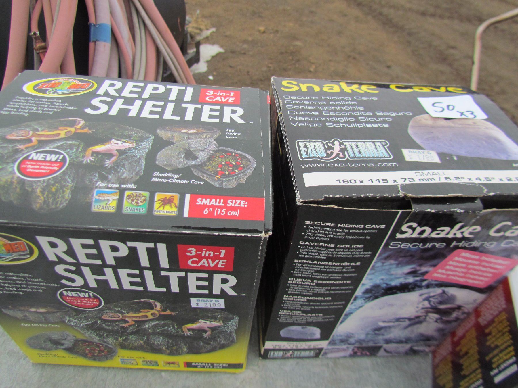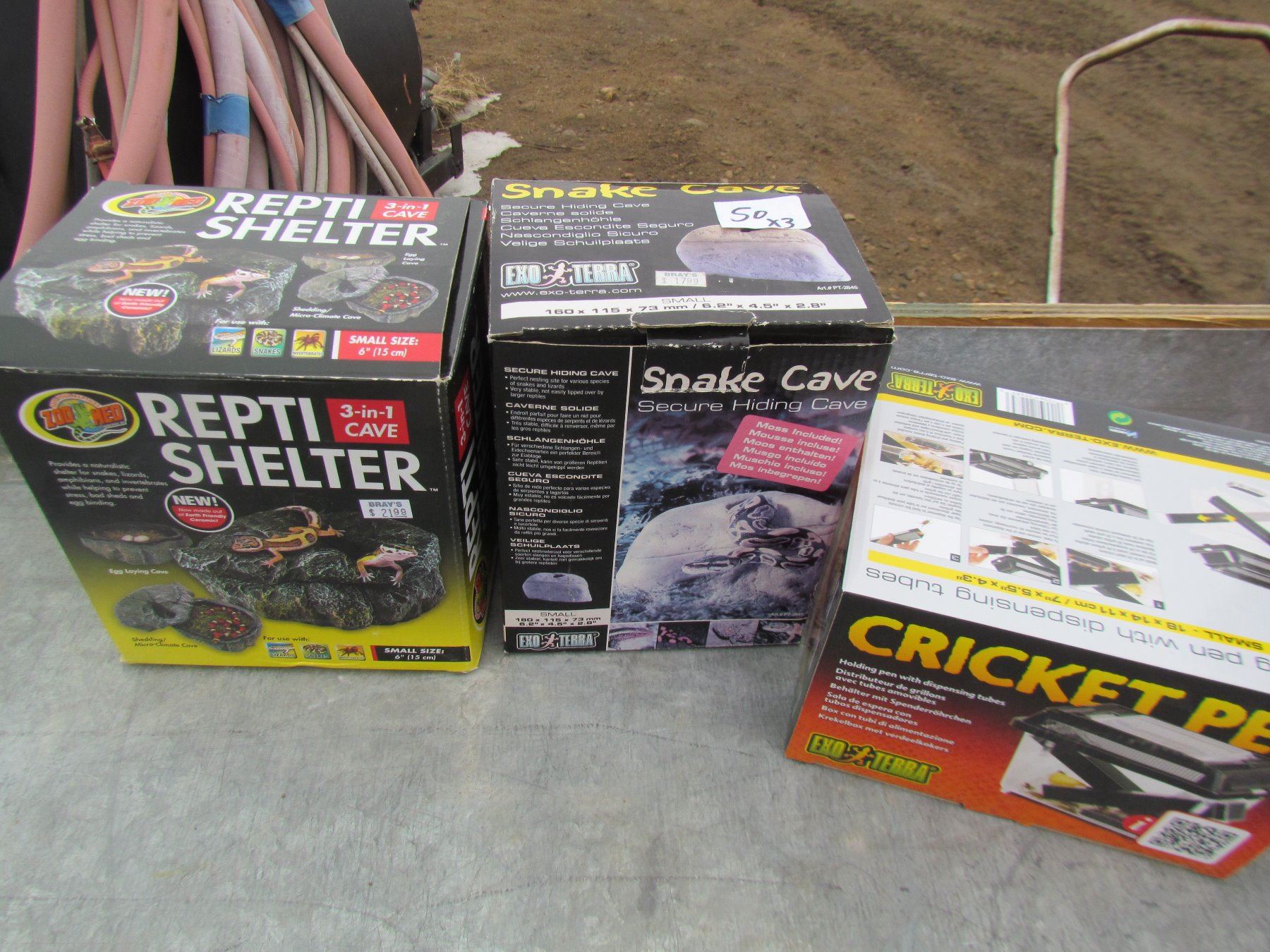 LOT OF REPTILE EQUIPMENT (SHELTER, SNAKE CARE, CRICKET PEN) *NOS*
