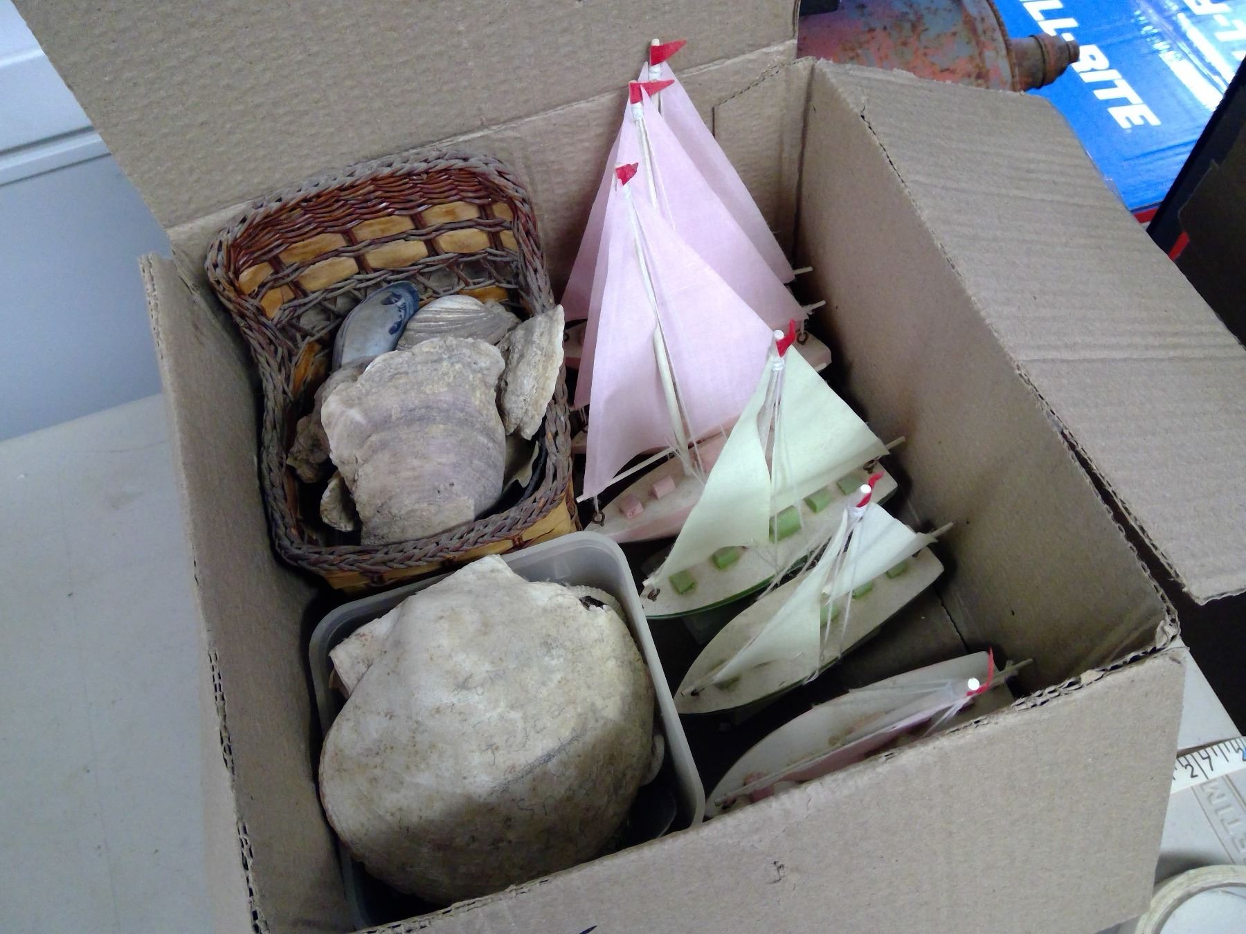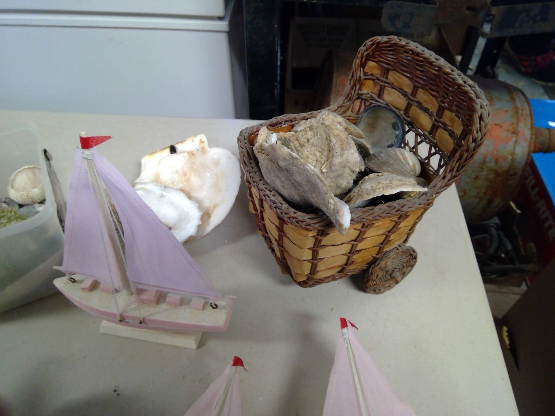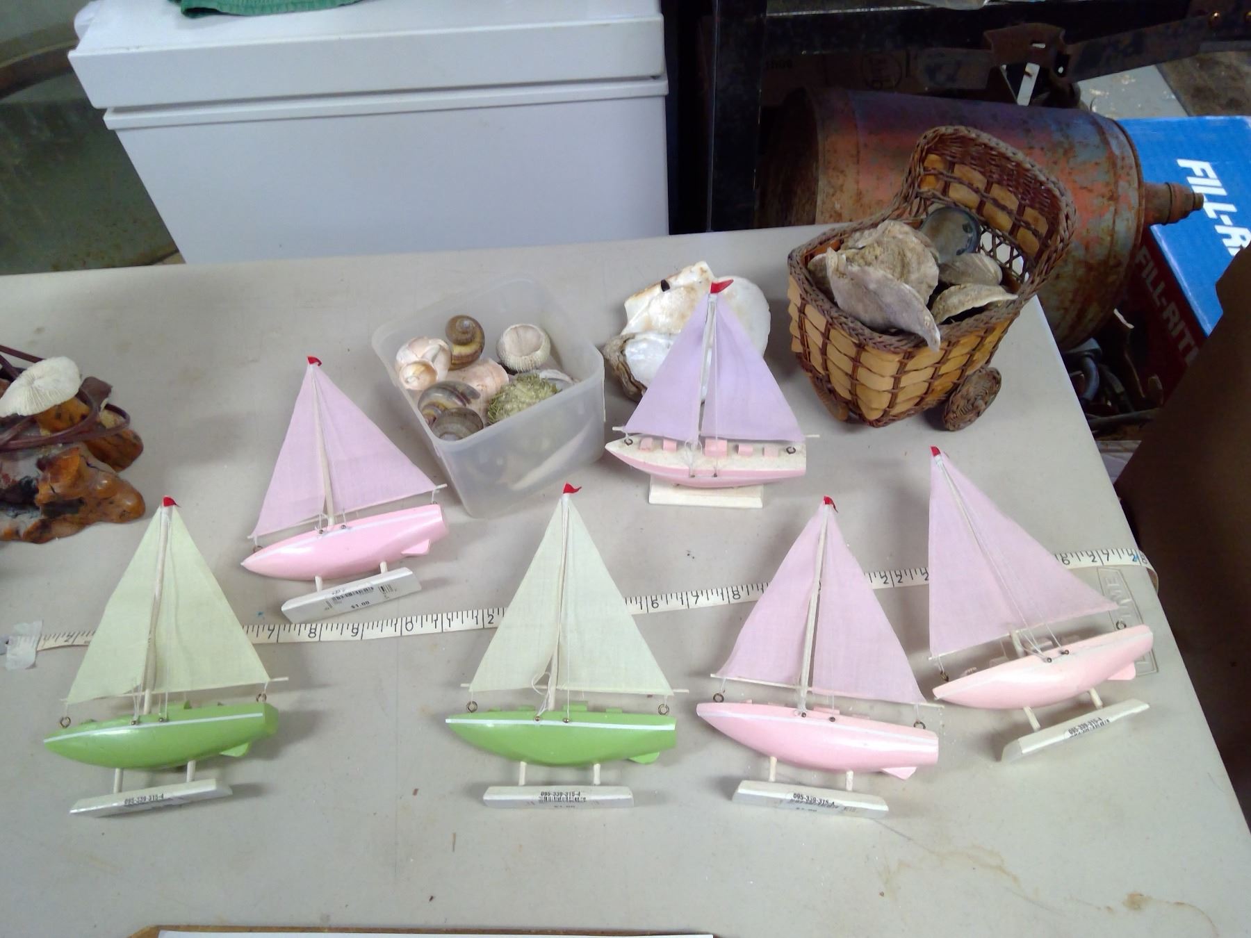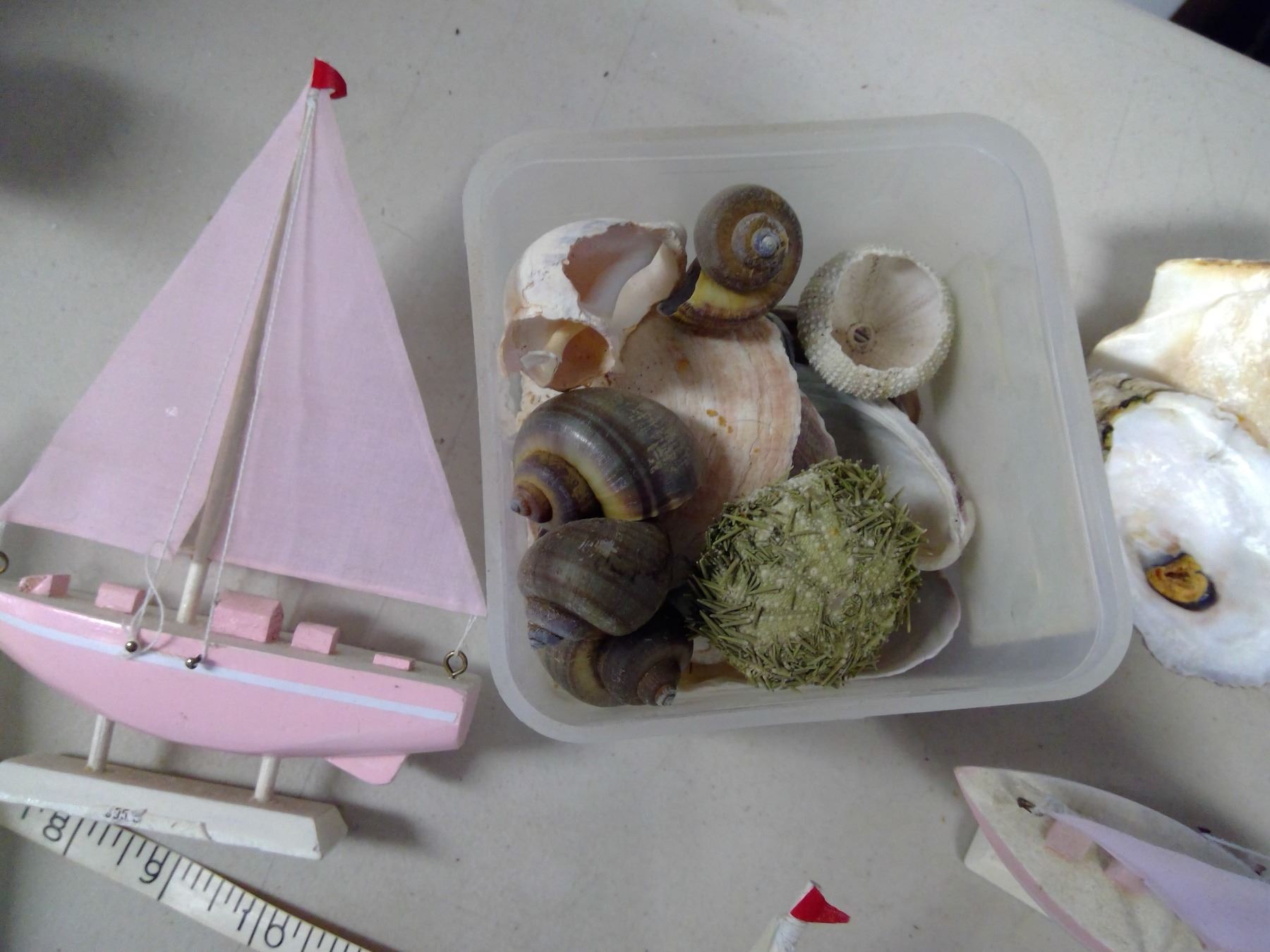 LOT OF SEASHELLS AND WOODEN DECORATIVE BOATS