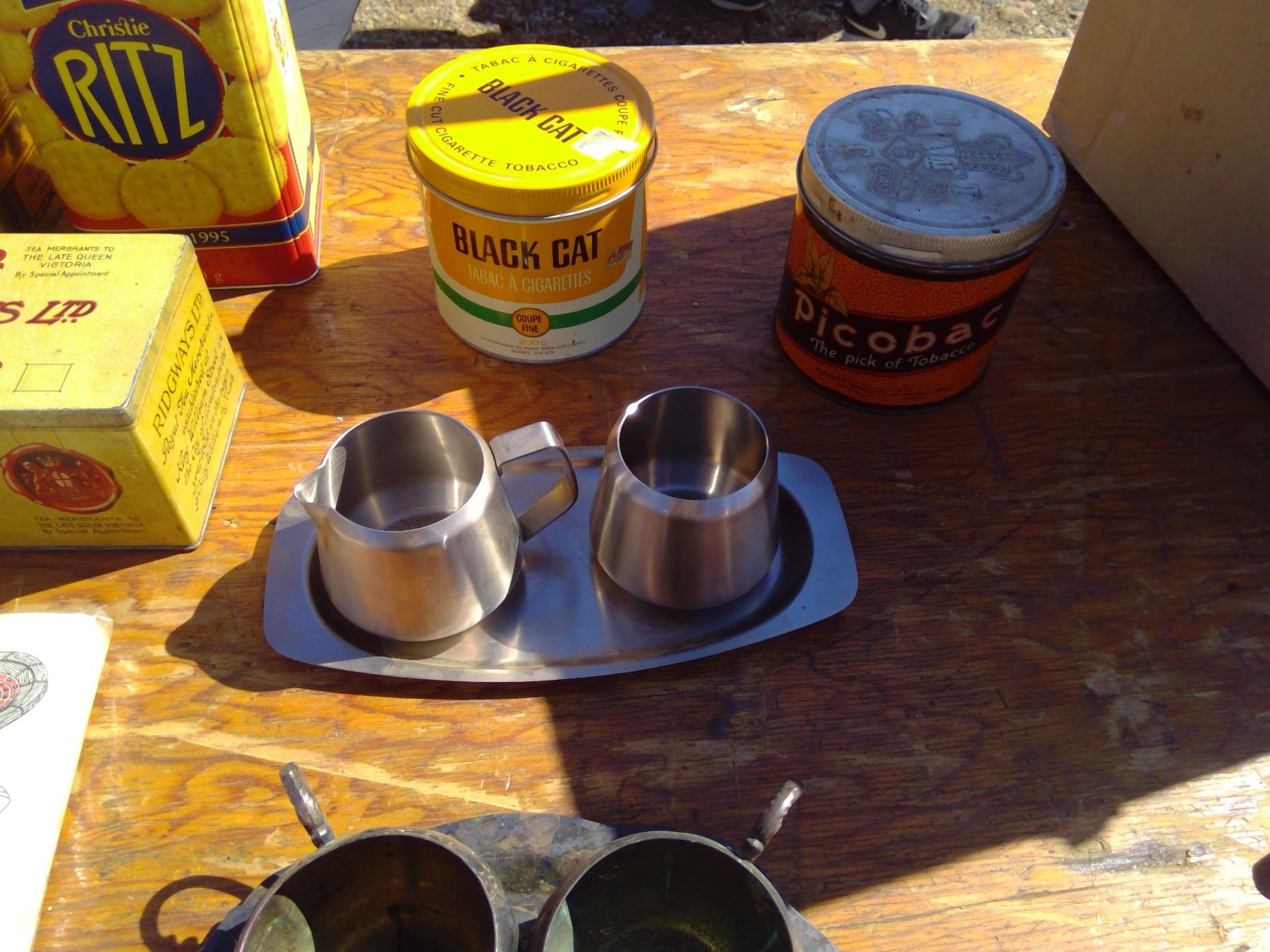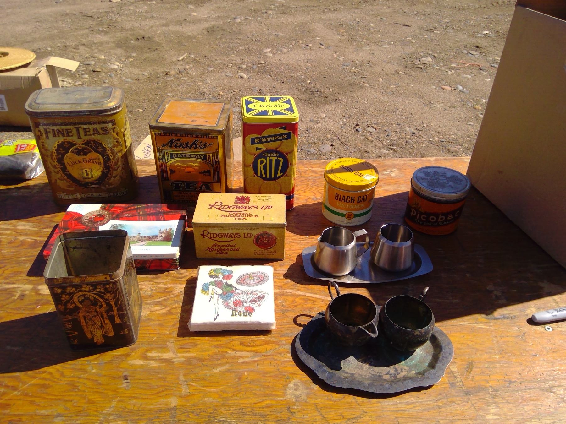 LOT OF TINS + CREAM AND SUGAR DISHES + NAPKINS