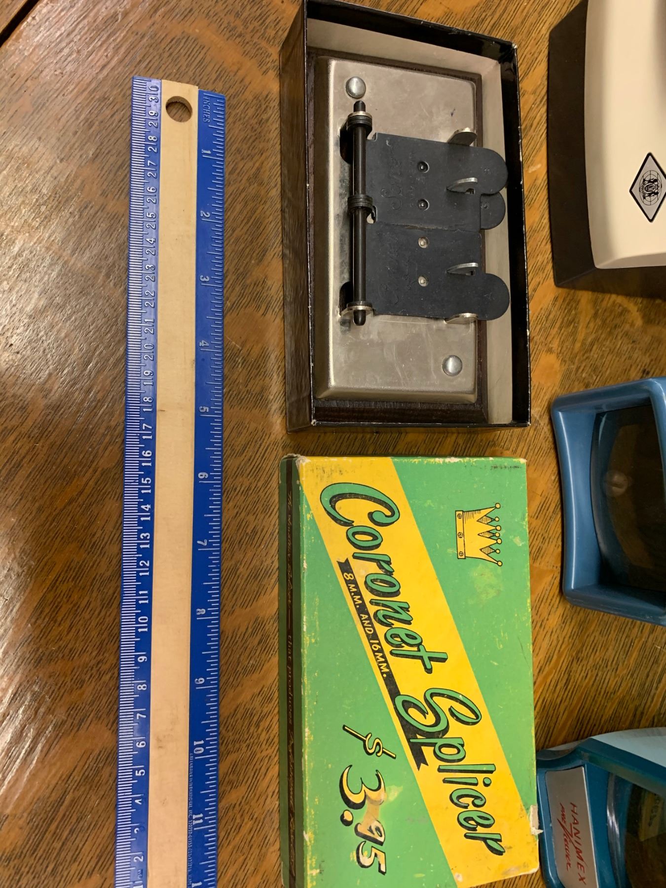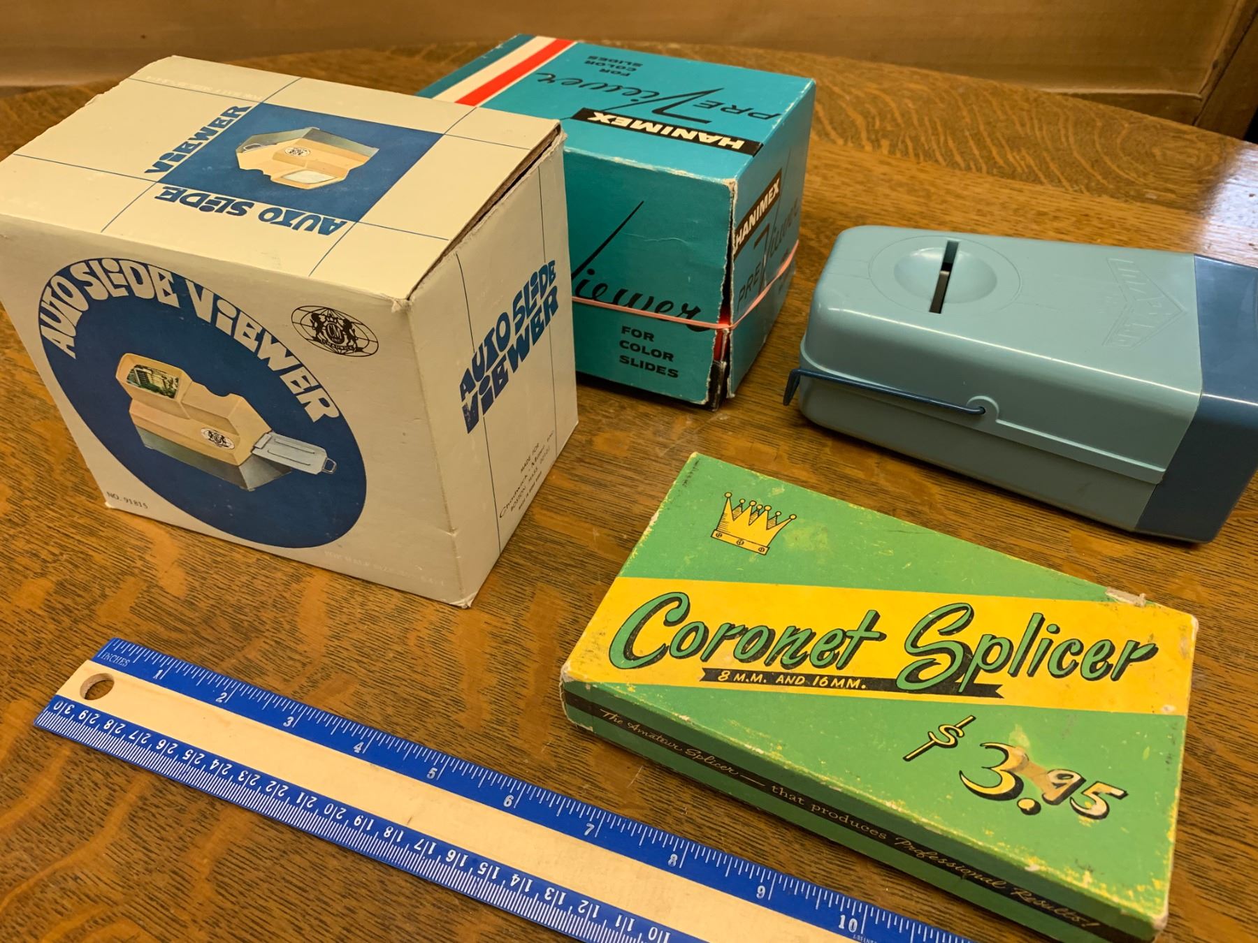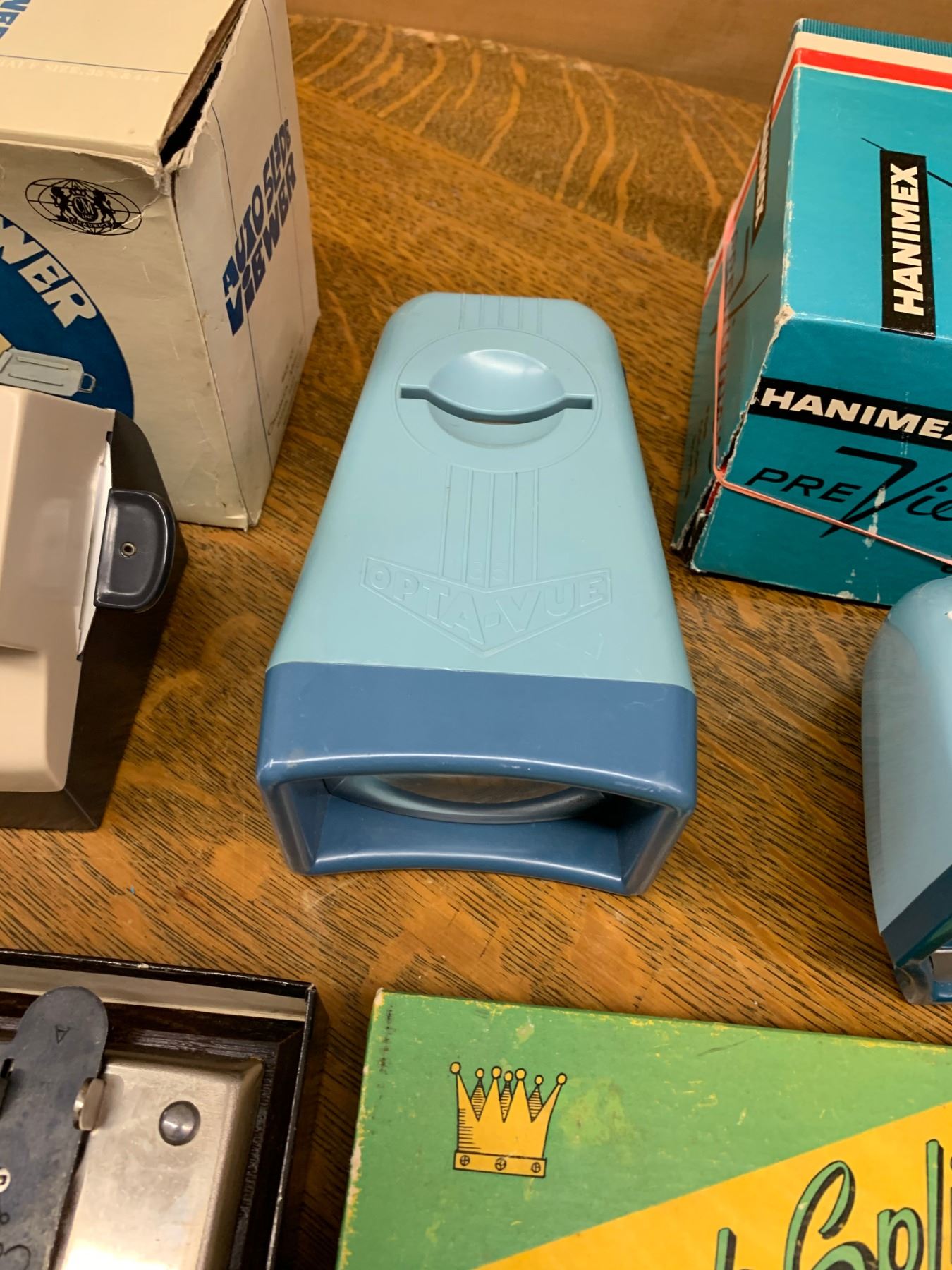 LOT OF VINTAGE SLIDE VIEWERS, FILM SPLICER AND BOXES